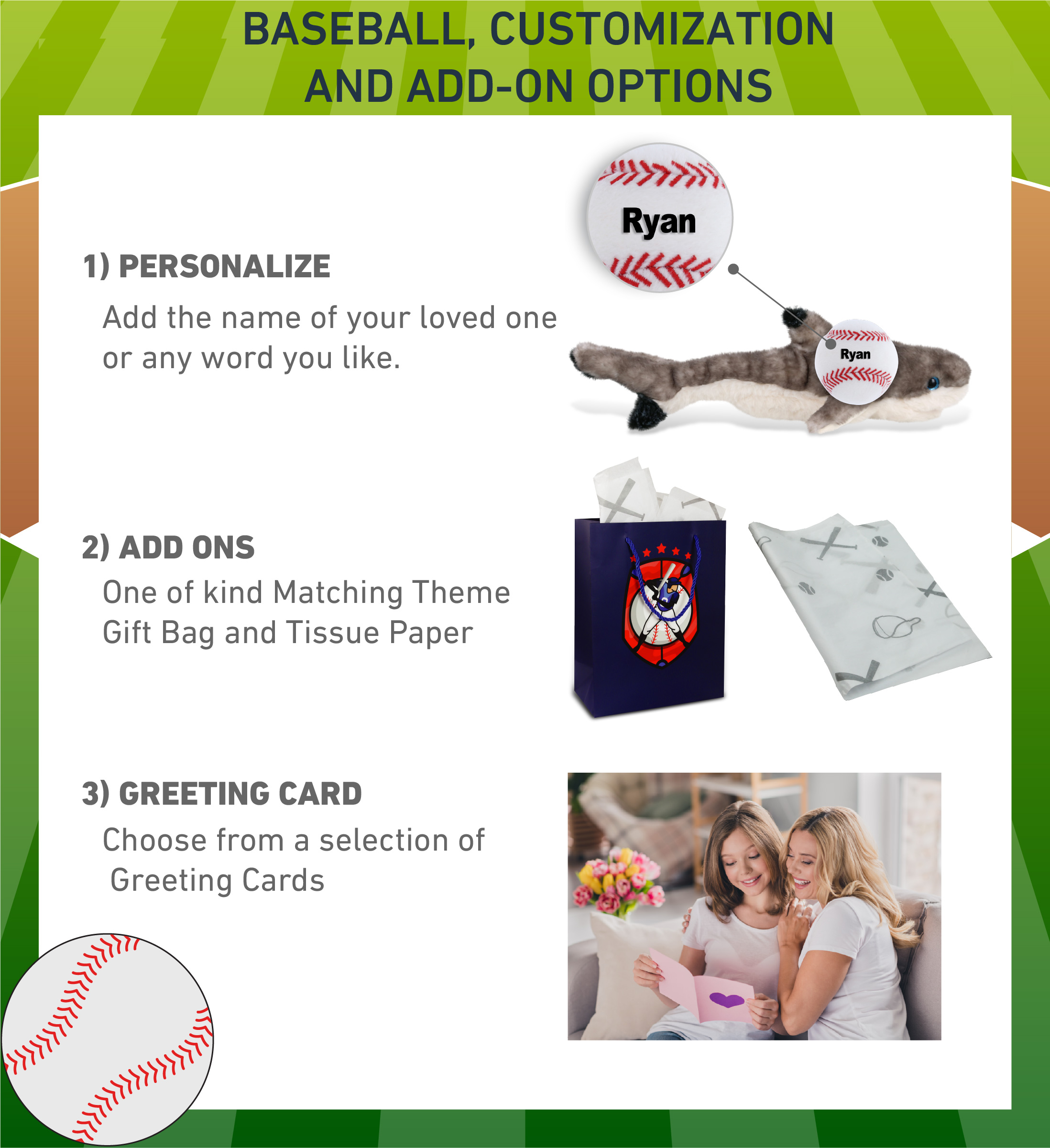 • Personalization, Customization, and Add-On Options – The Super Soft Sports Stuffed Animal Blacktip Reef Shark comes customized with a small baseball plush. You can personalize your stuffed animal shark with the name of your loved one which we will imprint on the item. You also have the option to add some or all of the cool add-ons to make your gift extra special: 1) Gift Bag; 2) Tissue Paper; 3) Greeting Card.