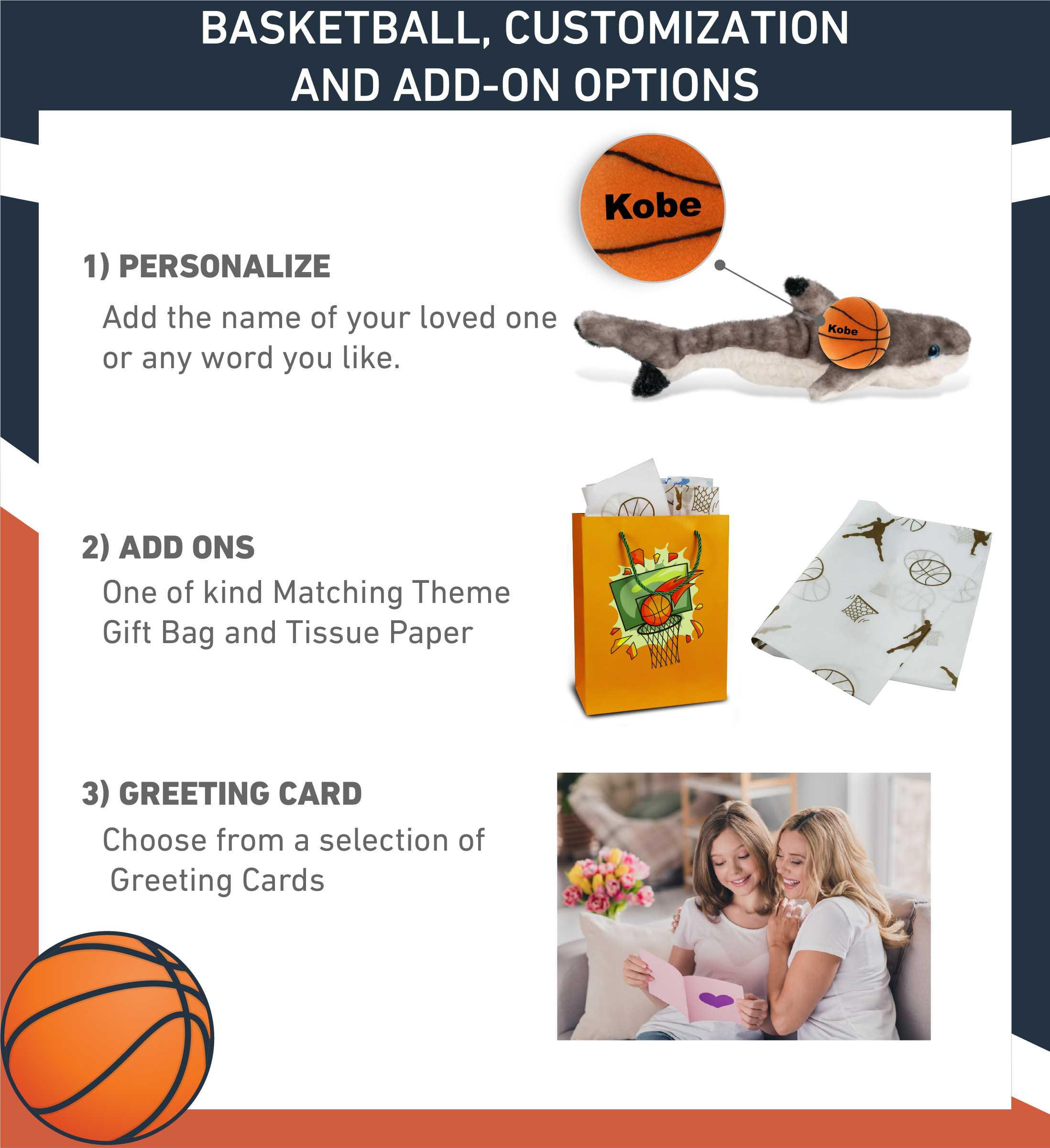 - Personalization, Customization, and Add-on Options – The Super Soft Sports Stuffed Animal Blacktip Reef Shark comes customized with a basketball plush. You can personalize your shark plush toy with the name of your loved one, which we will imprint on the item. You also have the option to add some or all of the cool add-ons to make your plush gift extra special: 1) Gift Bag; 2) Tissue Paper; 3) Greeting Card.