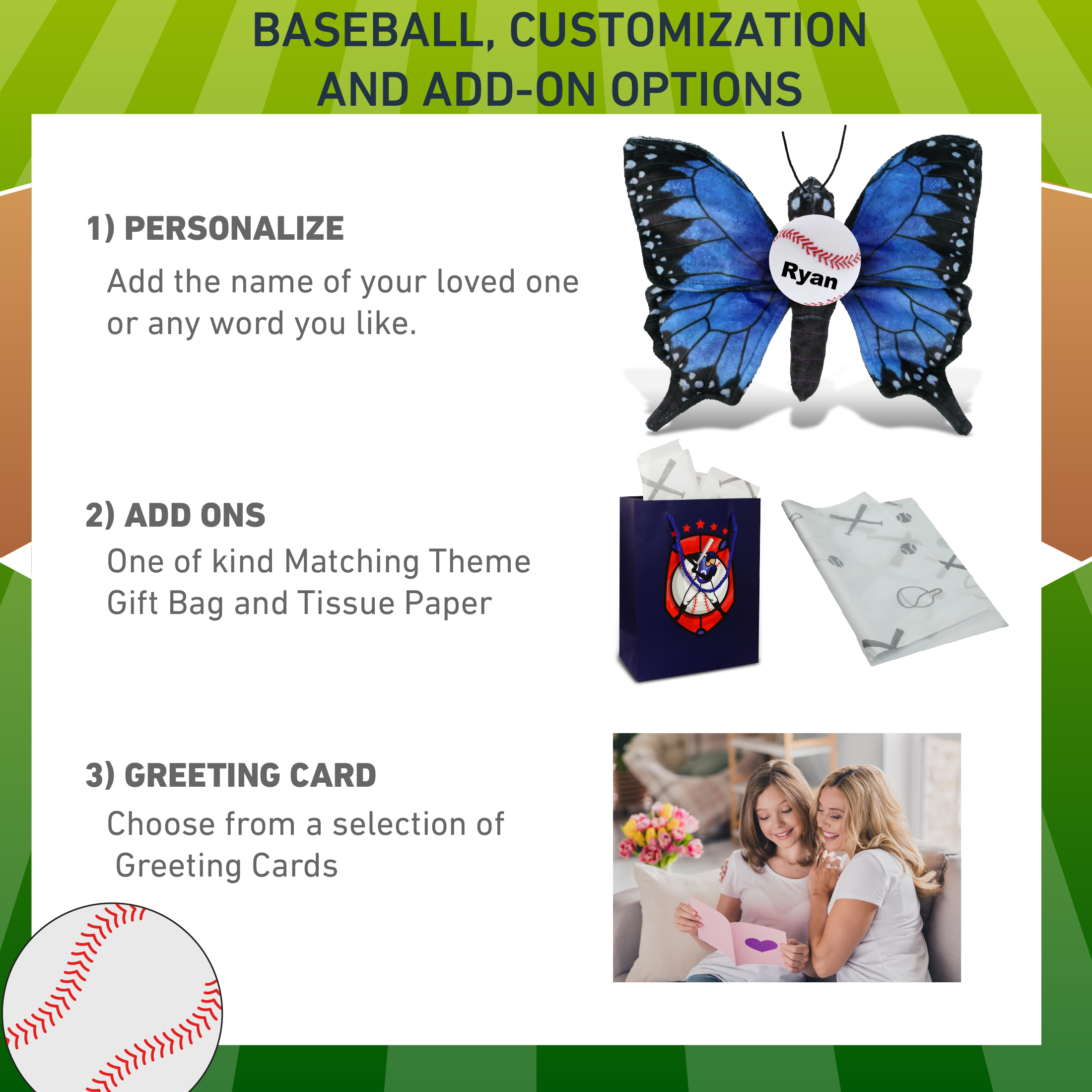 - Personalization, Customization, and Add-On Options – The Super Soft Sports Stuffed Animal Blue Butterfly comes customized with a small baseball plush. You can personalize your stuffed animal butterfly with the name of your loved one which we will imprint on the item. You also have the option to add some or all of the cool add-ons to make your gift extra special: 1) Gift Bag; 2) Tissue Paper; 3) Greeting Card.