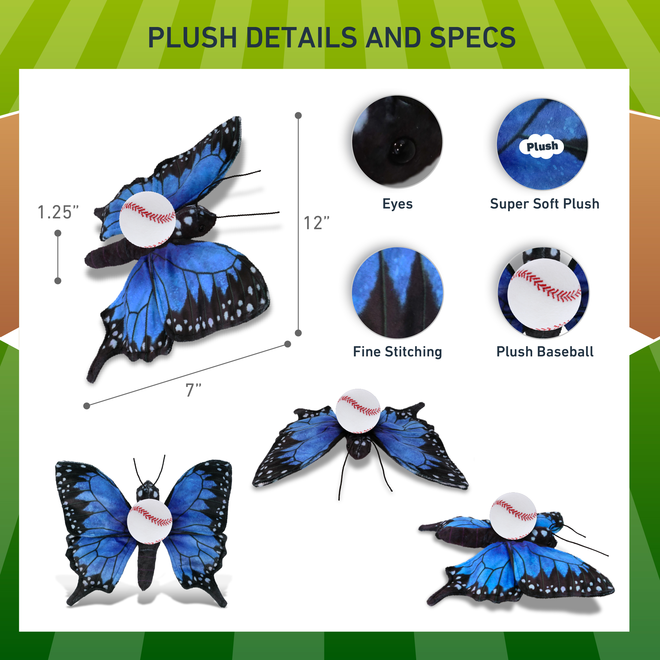 - Included with The Purchase of Butterfly Plush with Baseball Ball – Includes 1 DolliBu Wild Collection Blue Butterfly Stuffed Animal with a baseball plush, decorated with realistic features. The baseball sports ball is attached to the butterfly’s body, making it perfect for cuddles. The butterfly plush toy features realistic details. The butterfly’s eyes make the critter so charming. The cute plush toy buddy measures 12Lx7Wx1.25H inches.