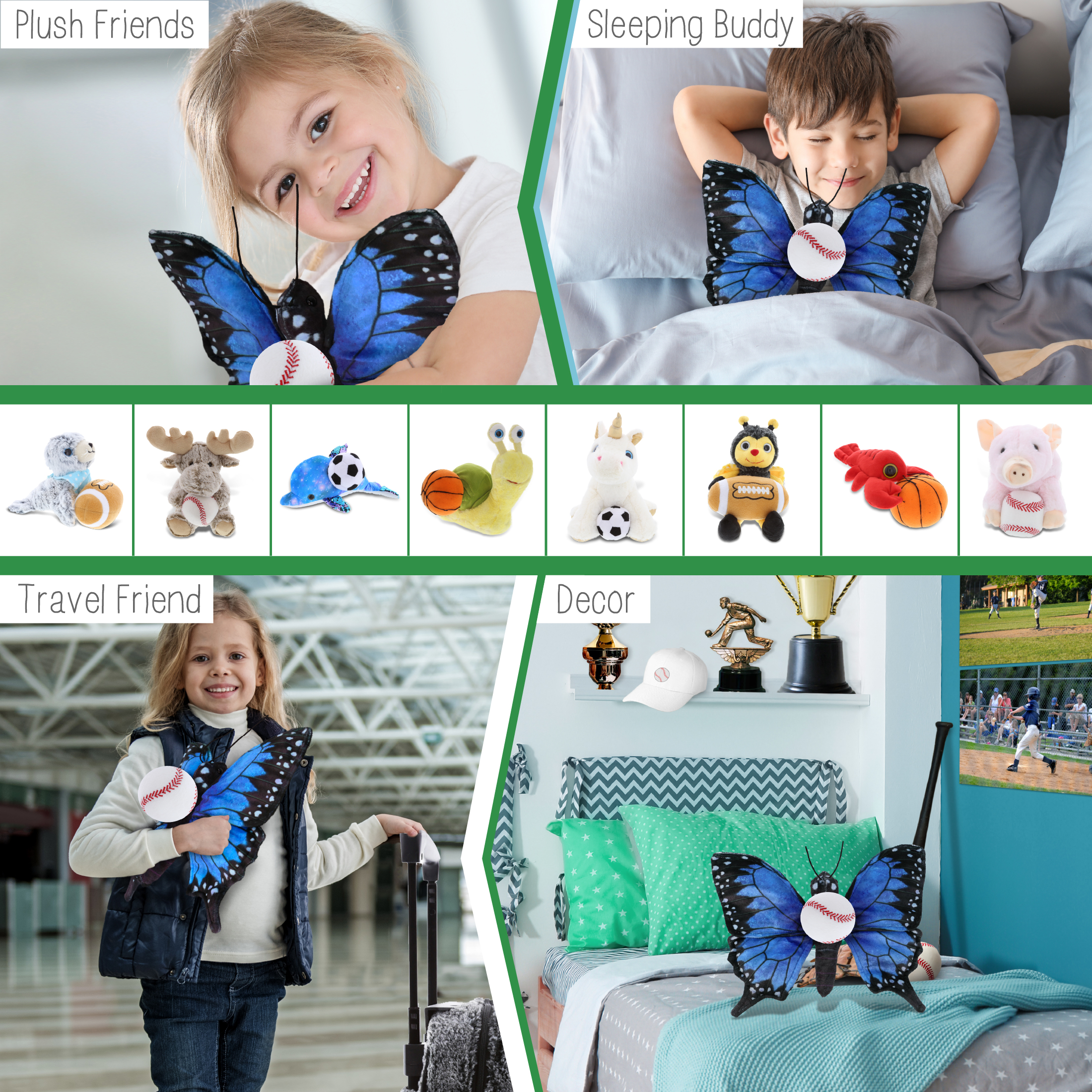 - Ideal Use for the Kids Baseball Plush and Stuffed Butterfly – The butterfly baseball stuffed animal makes a great addition to your kids baseball stuff for boys collection. Great gifts for boys who love sports and plush dolls. If you’re looking for the perfect baseball gift ideas for kids, then this stuffed butterfly with baseball plush is the perfect choice. It’s the perfect stuffed animal baseball birthday gifts to give on any special occasion.