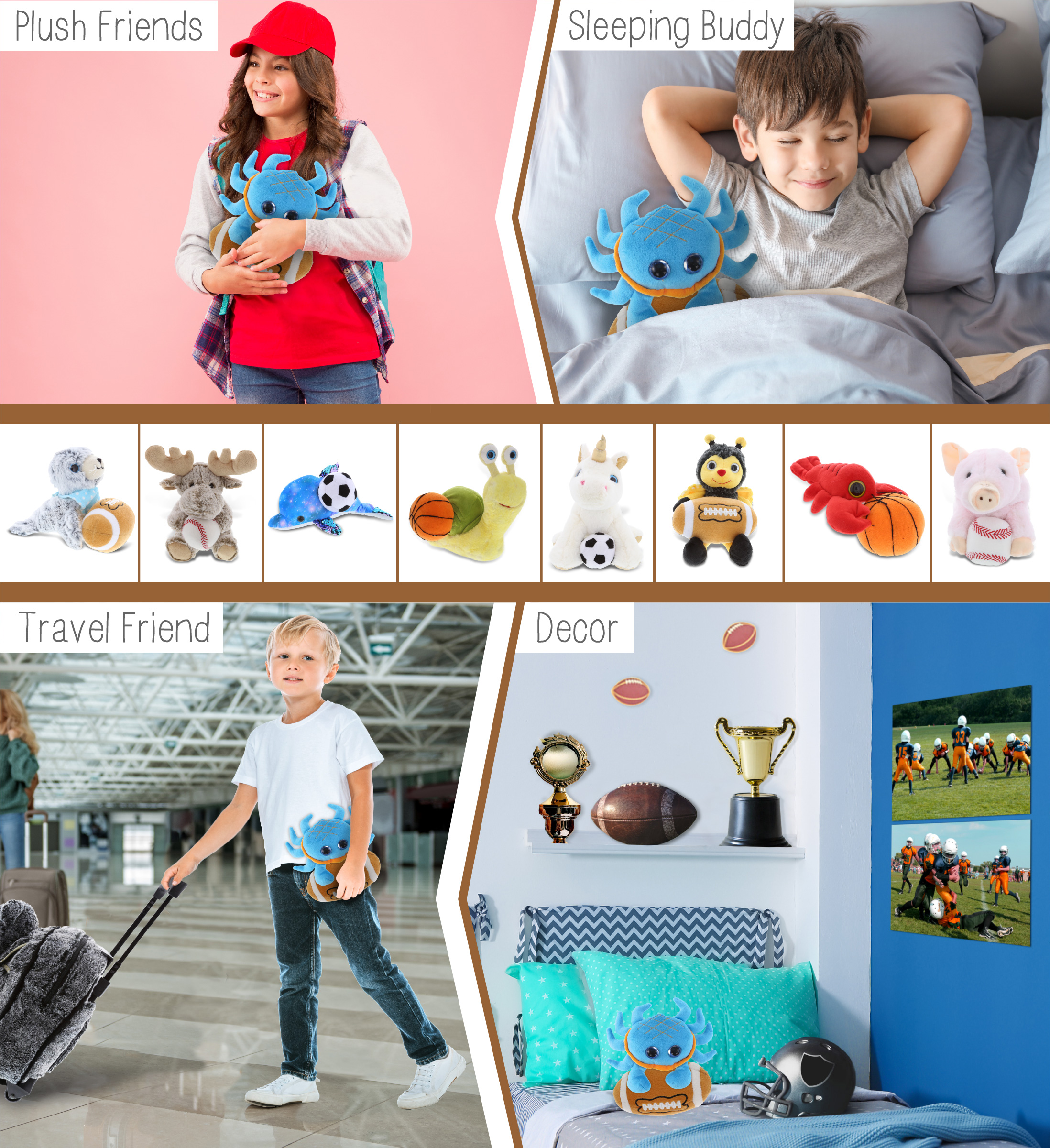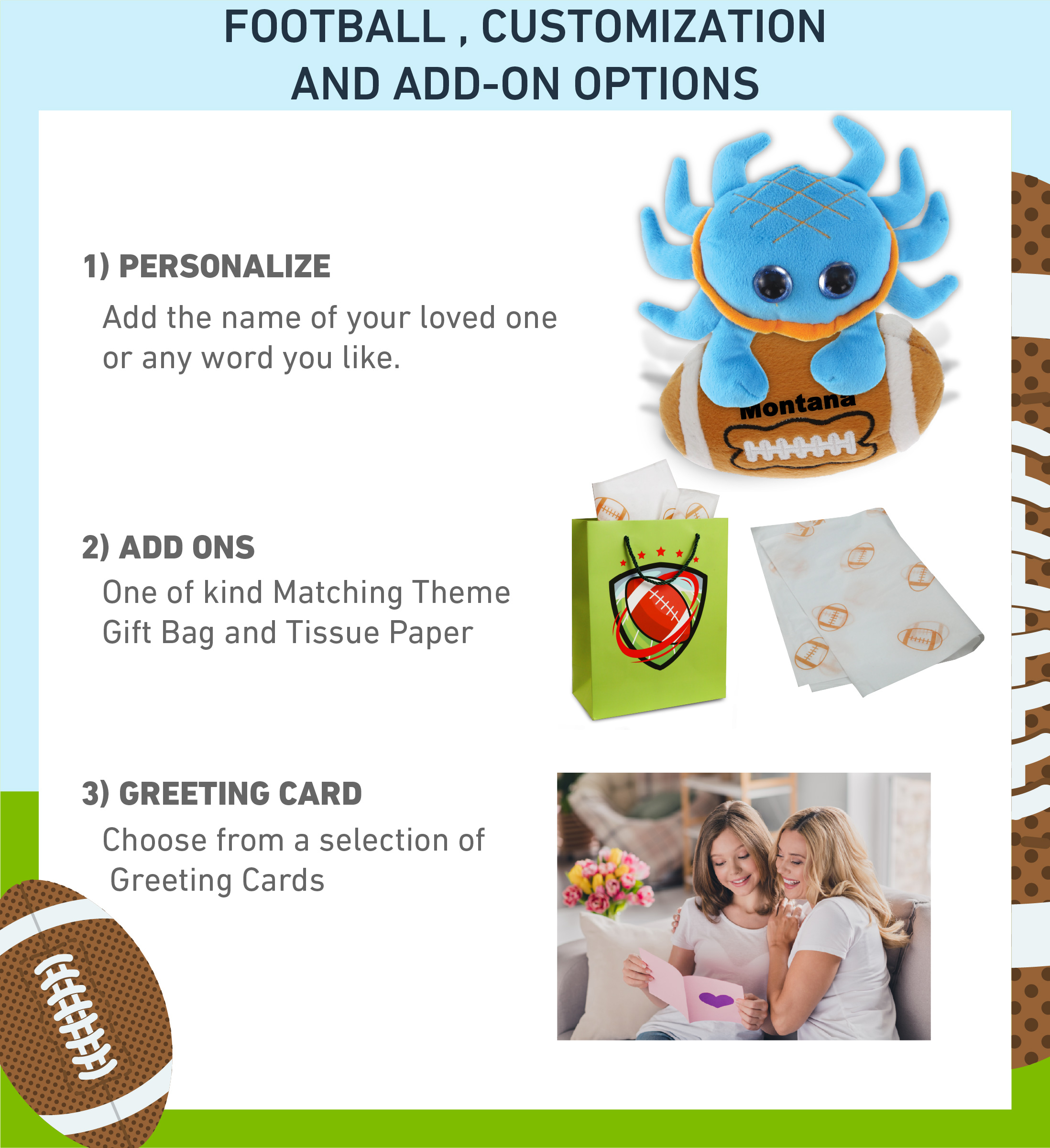 - PERSONALIZATION, CUSTOMIZATION, AND ADD-ON OPTIONS – The Super Soft Sports Stuffed Animal Big Eye Blue Crab comes customized with a Football Plush. You can personalize your blue crab plush toy with the name of your loved one imprinted on the item. You also have the option to add some or all of the cool add-ons to make your gift extra special: 1) Gift Bag; 2) Tissue Paper; 3) Greeting Card.