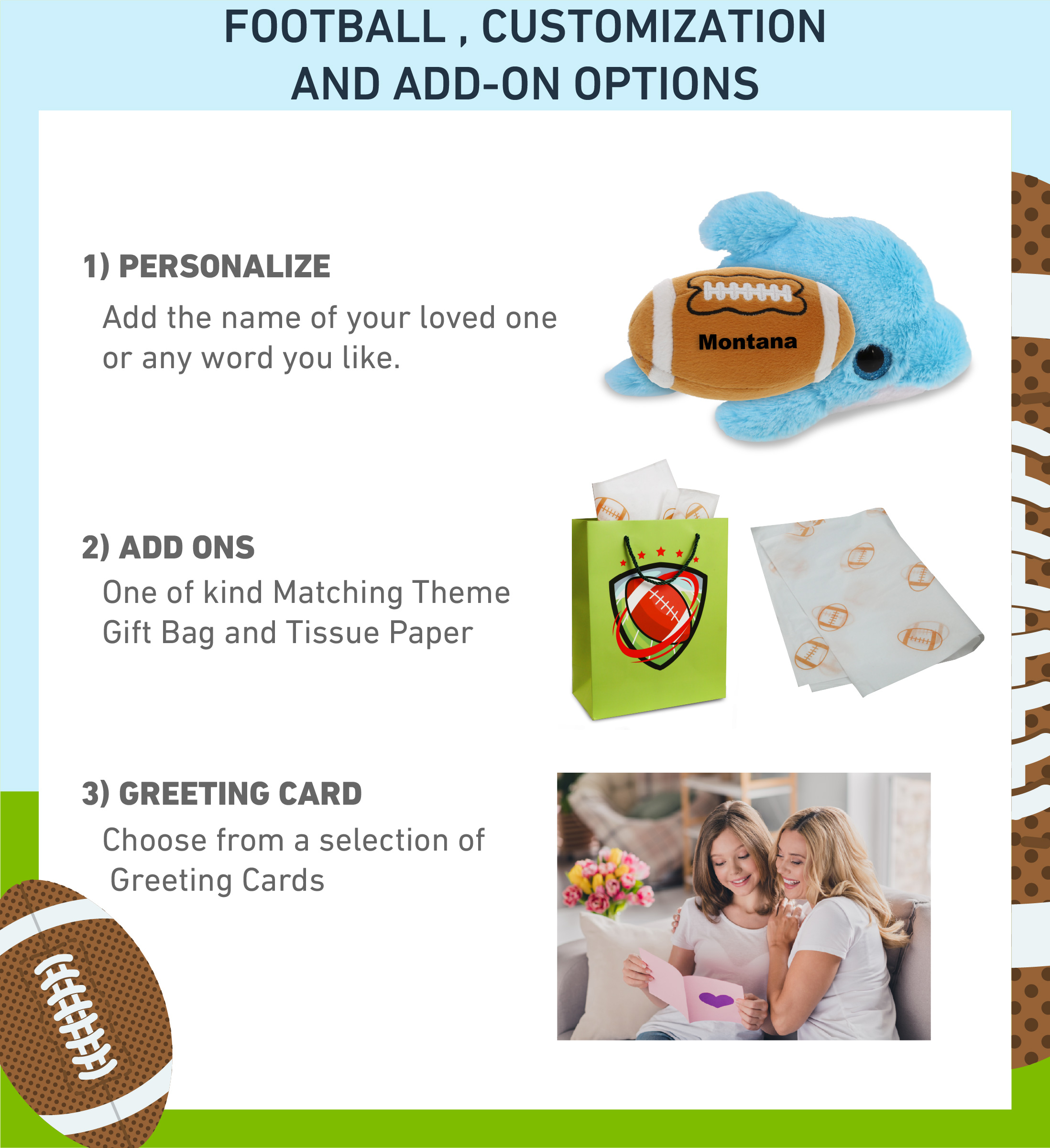 • Personalization, Customization, and Add-On Options – Super Soft Sports Stuffed Animal Big Eye Blue Dolphin comes customized with a football plush. You can personalize it with the name of your loved one imprinted on the item. You also have the option to add some or all of the cool add-ons to make your gift extra special: 1) Gift Bag; 2) Tissue Paper; 3) Greeting Card.