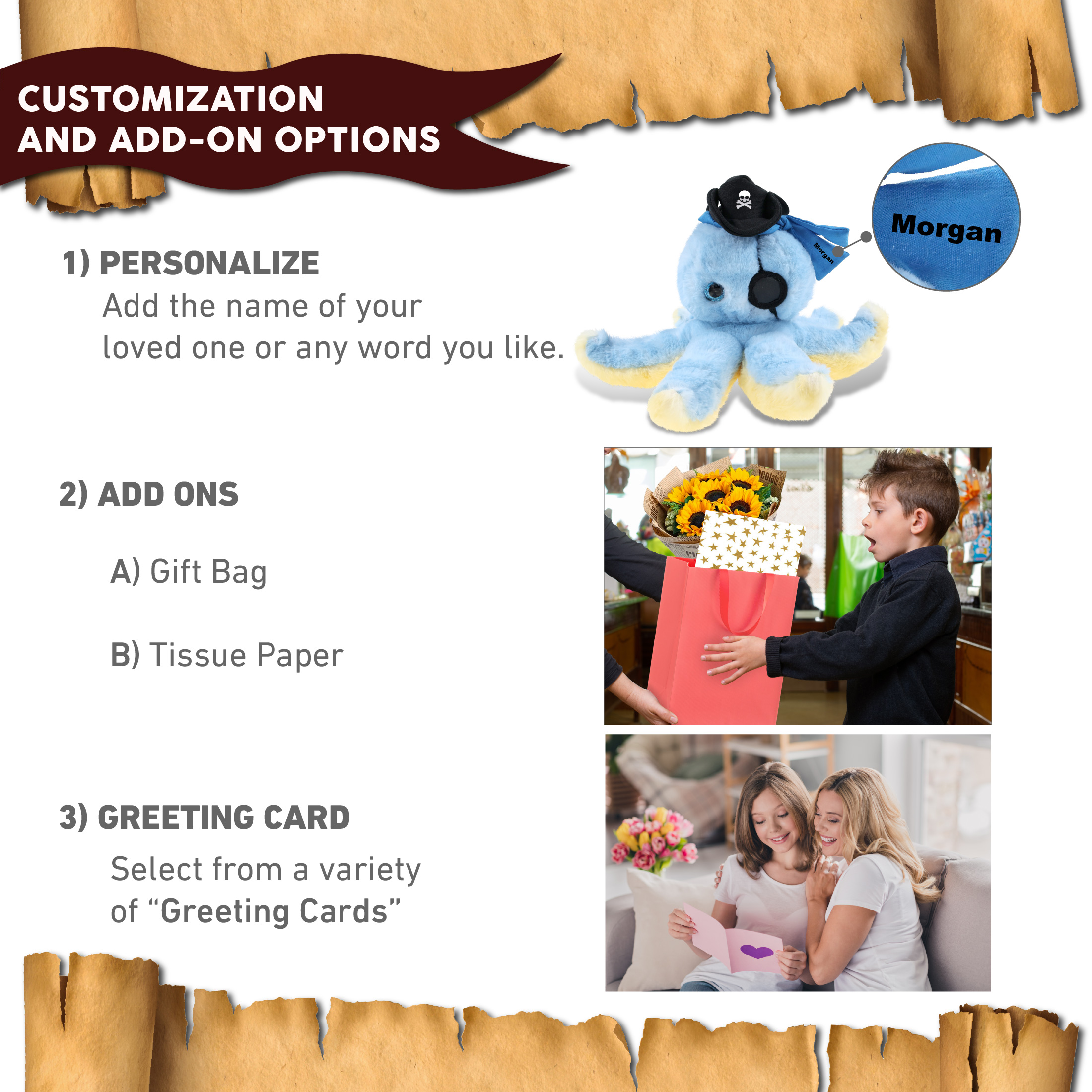 - Personalization, Customization, and Add-On Options – The stuffed animal plush blue octopus figure stuffed toy comes with a cute pirate hat. Make your plush blue octopus special by adding a personalized name, which we will imprint onto the plush. You can also customize your stuffed animal pirate octopus doll by adding any of our add-ons to create the perfect gift: 1) Gift Bag 2) Tissue Paper 3) Greeting Card.