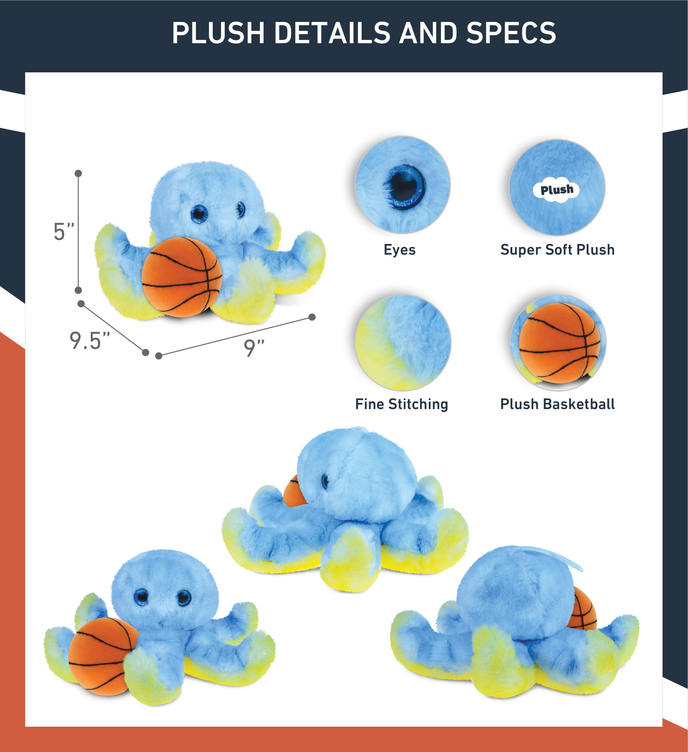 - Included with the Purchase of Adorable Cute Octopus Plush – Includes 1 DolliBu Super Soft Blue Octopus with a basketball plush, decorated with realistic features of a cute plush animal. The body with a sports gift ball plush makes the plush perfect for cuddles. The octopus plush toy features details like its characteristic long tentacles. The octopus eyes make the critter so charming. The plush toy buddy measures 9.5Lx9Wx5H inches.