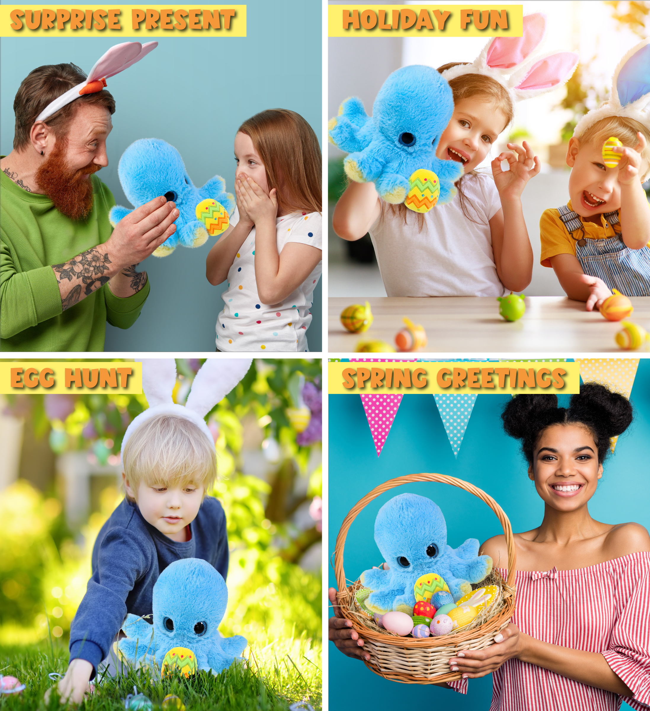 - THE SPRING OCTOPUS IS FOR ANYONE WHO LOVES CUTE STUFFED ANIMAL TOYS – The Big Eye Blue Octopus plush stuffed animal designed with a spring theme is a sweet plush Easter bear gift for your loved ones. Welcome the new season and share the joy of Spring with friends and family of all ages by gifting them Easter plush stuffed animals. It is a colorful Easter egg stuffed animal that will make a cute addition to boys and girls animal Easter basket.