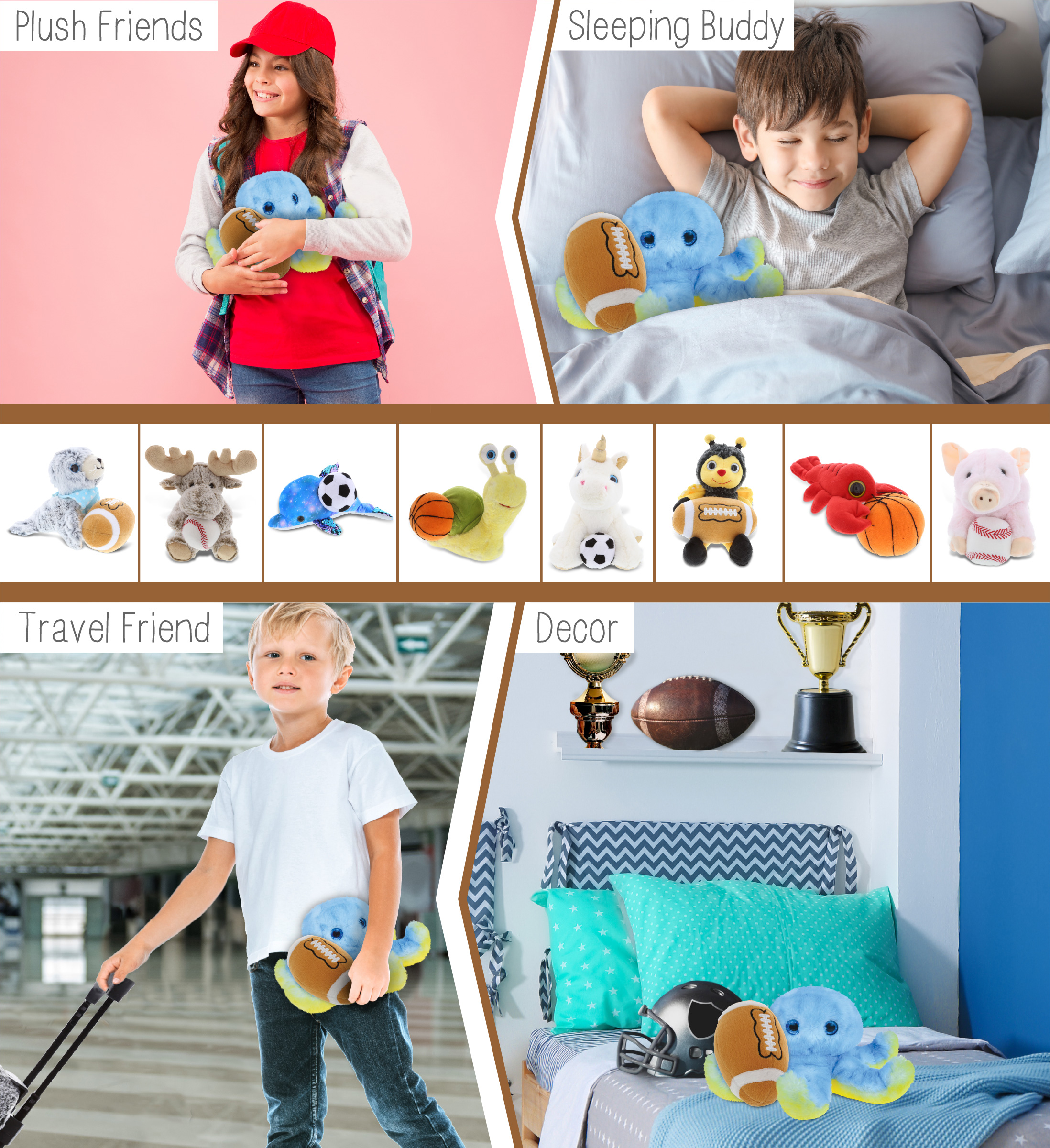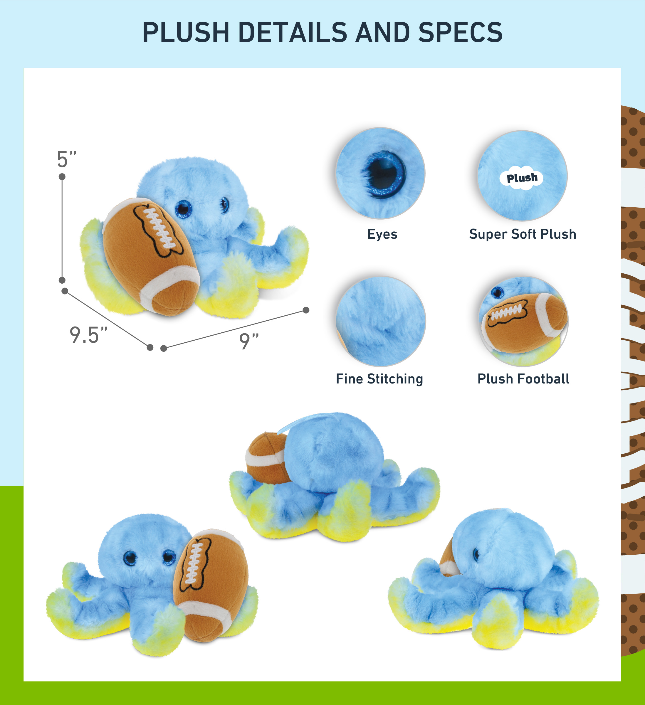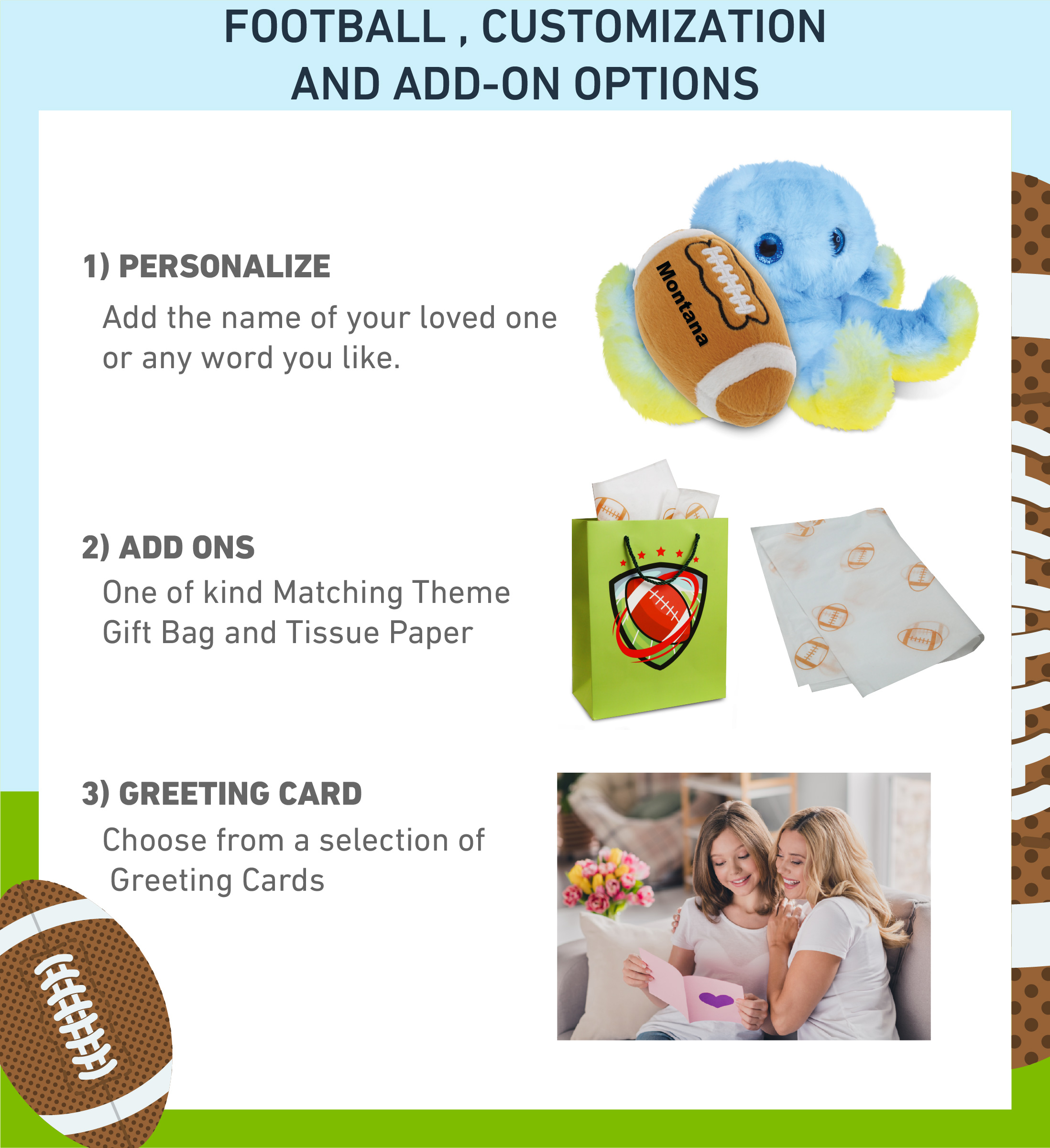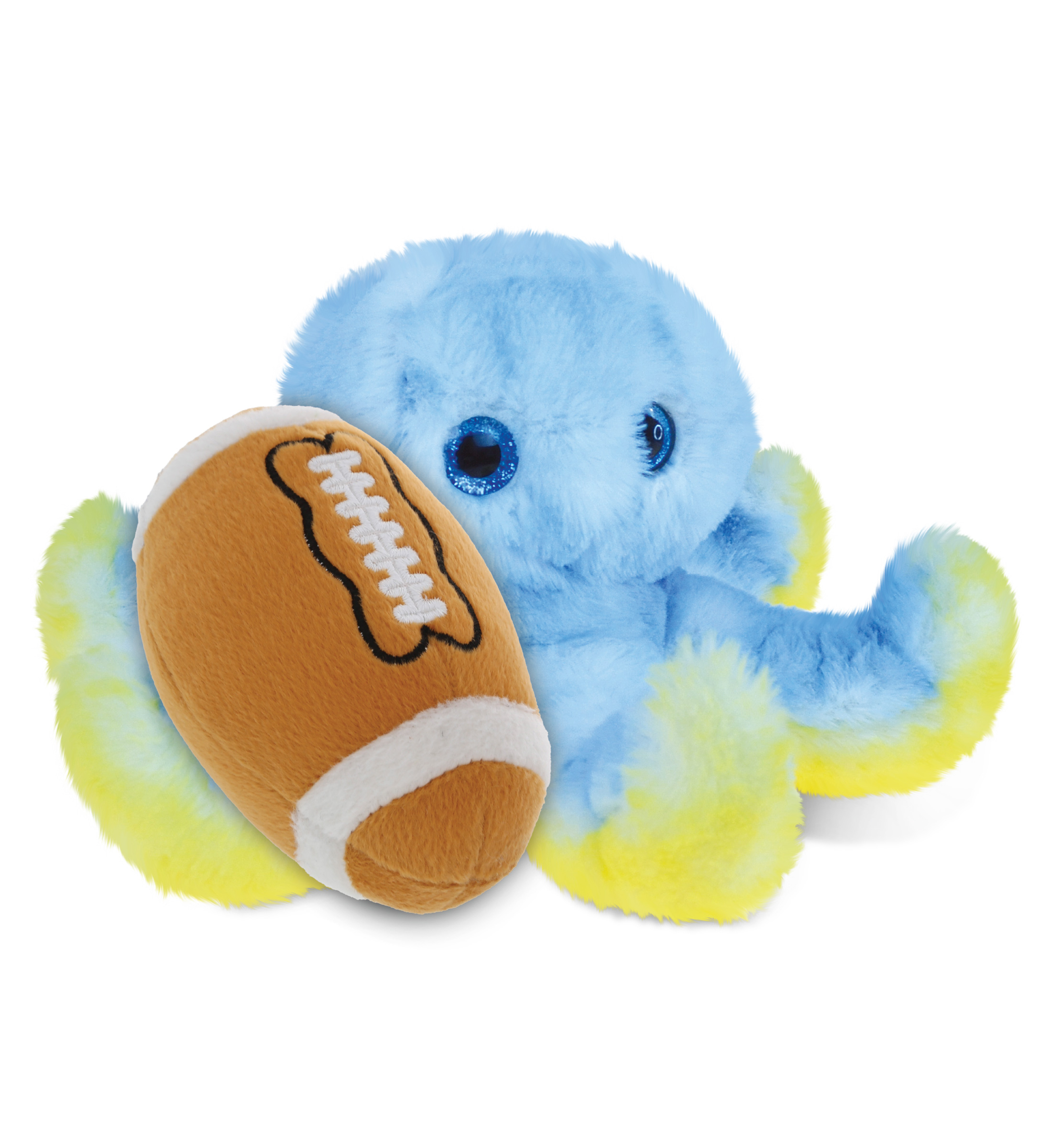 - Personalization, Customization, and Add-On Options – Super Soft Sports Stuffed Animal Blue Octopus comes customized with a football plush. You can personalize it with the name of your loved one imprinted on the item. You also have the option to add some or all of the cool add-ons to make your gift extra special: 1) Gift Bag; 2) Tissue Paper; 3) Greeting Card.