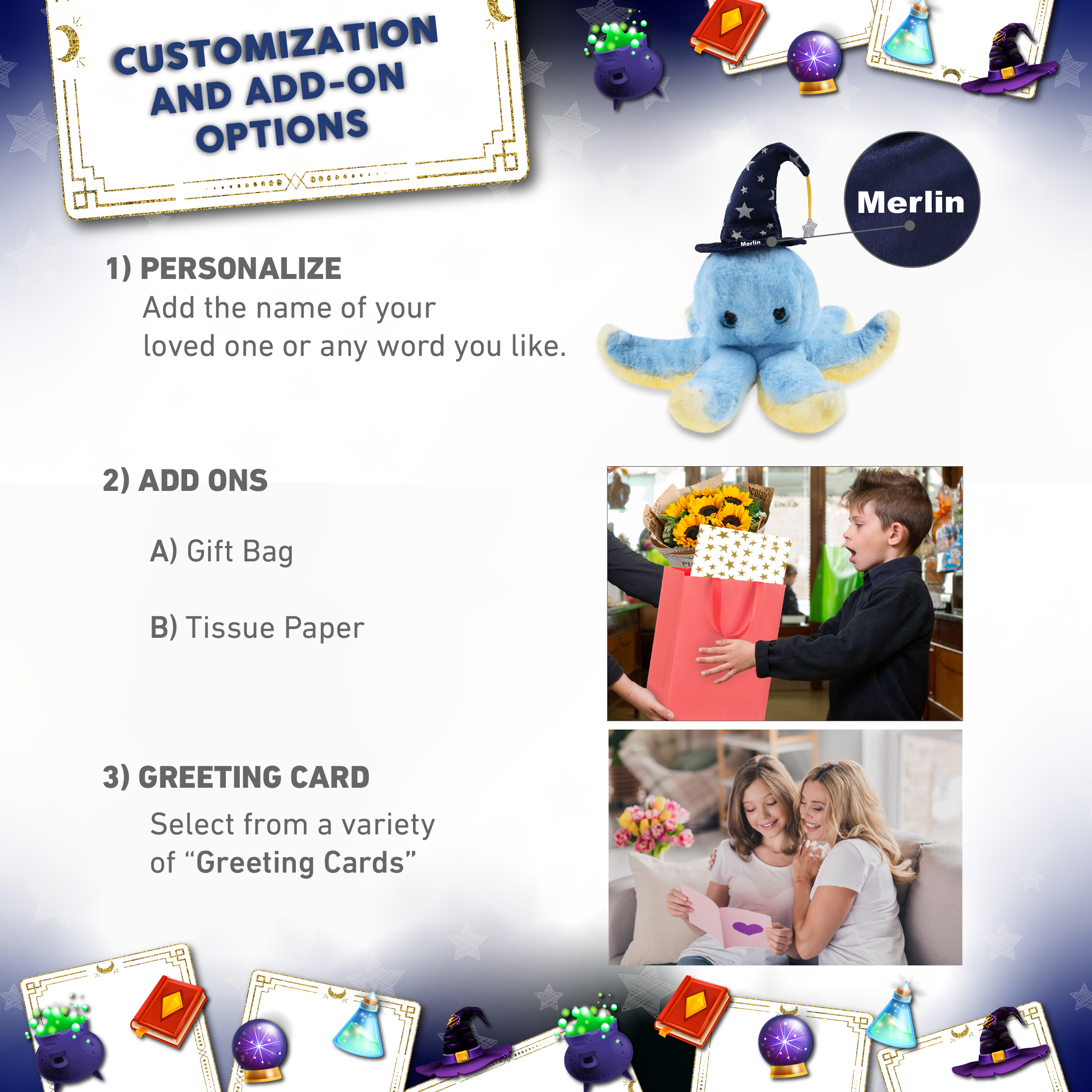 - Personalization, Customization, and Add-On Options – The blue octopus stuffed animal comes in an enchanting wizard hat with silver star details. Make your wizard stuffed octopus special by adding a personalized name, which we will imprint onto the plush. You can customize your plush wizard toy by adding any of our add-ons to create the perfect gift: 1) Gift Bag 2) Tissue Paper 3) Greeting Card.