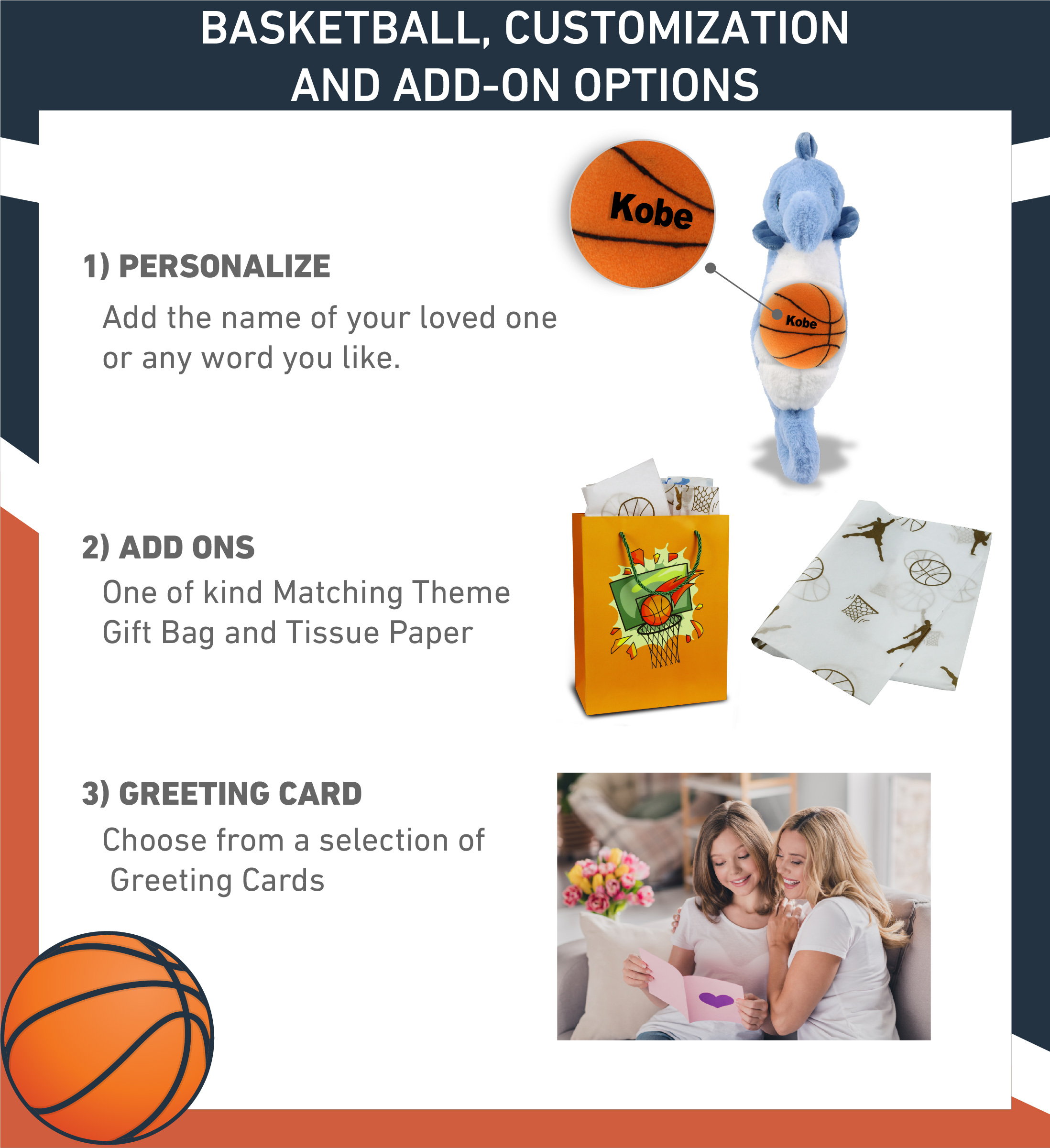 • Personalization, Customization, and Add-on Options – The Super Soft Sports Stuffed Animal Blue Seahorse comes customized with a basketball plush. You can personalize your seahorse plush toy with the name of your loved one, which we will imprint on the item. You also have the option to add some or all of the cool add-ons to make your plush gift extra special: 1) Gift Bag; 2) Tissue Paper; 3) Greeting Card.