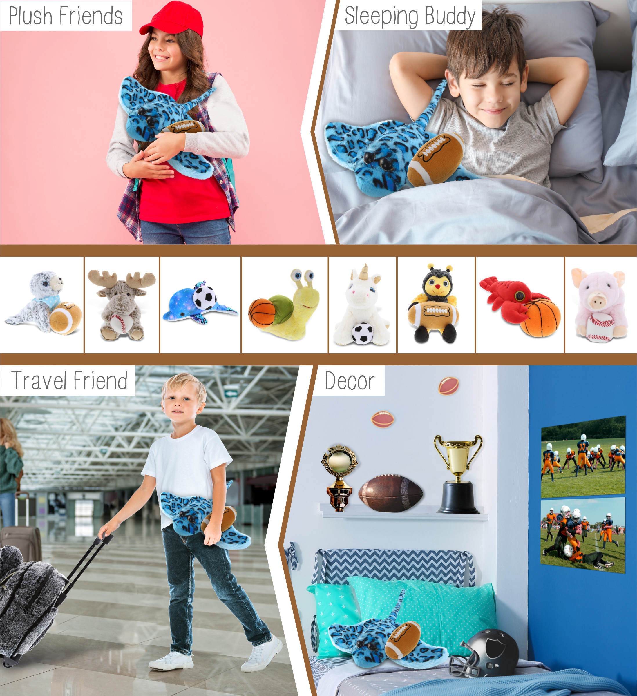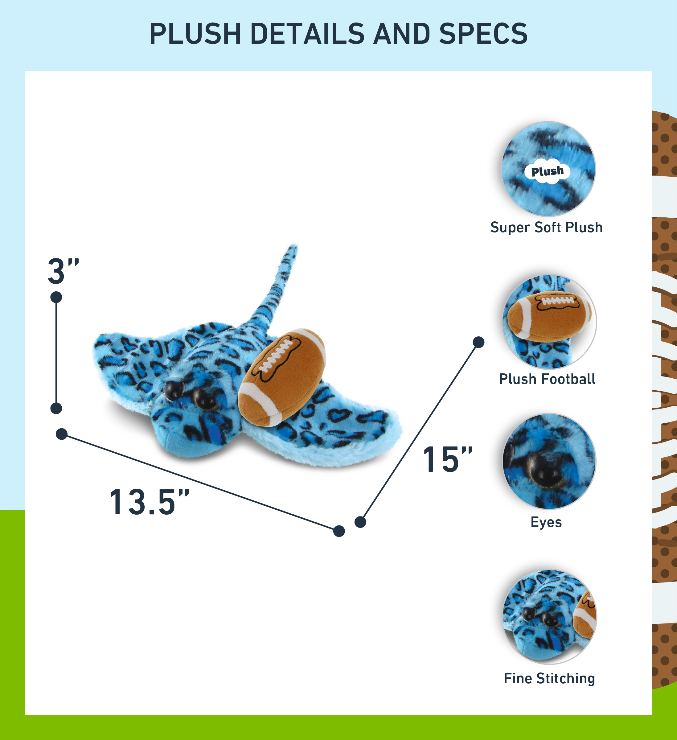 • PERSONALIZATION, CUSTOMIZATION, AND ADD-ON OPTIONS – The Super Soft Sports Stuffed Animal Blue Stingray comes customized with a Football Plush. You can personalize your blue stingray plush toy with the name of your loved one imprinted on the item. You also have the option to add some or all of the cool add-ons to make your gift extra special: 1) Gift Bag; 2) Tissue Paper; 3) Greeting Card.