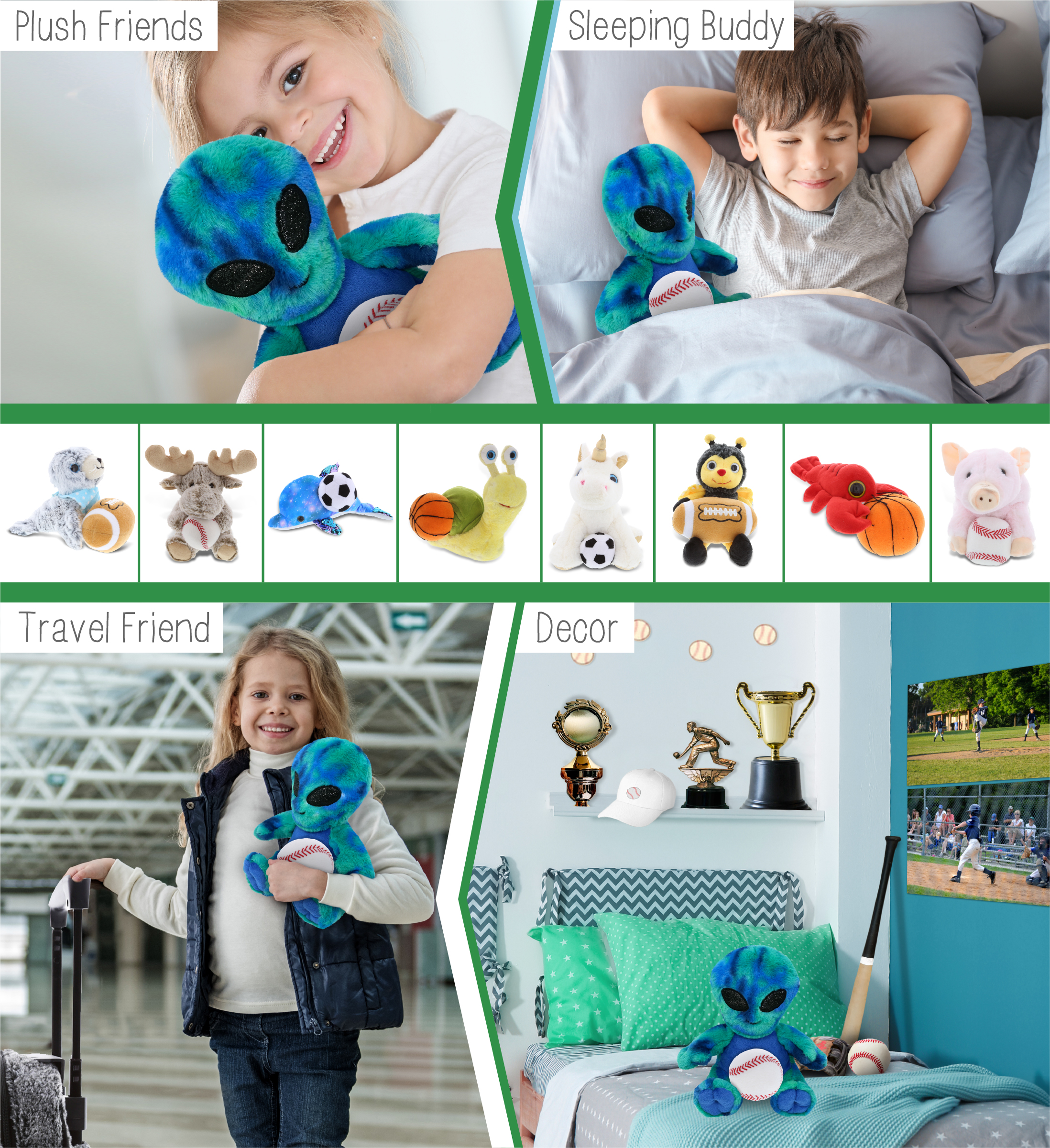- The Alien with Baseball Plush Toy Is for Everyone Who Loves Baseball Toys – Anyone will love receiving a cute stuffed toy with cool baseball plush. The girls and boys baseball toy and alien will be loved by all ages, making it perfect gifts for boys who love baseball. Super soft Blue Tie-Dye Alien stuffed animal are timeless gifts for baseball players, or as baseball fan gifts, and for kids who love decorating their rooms with baseball stuff.