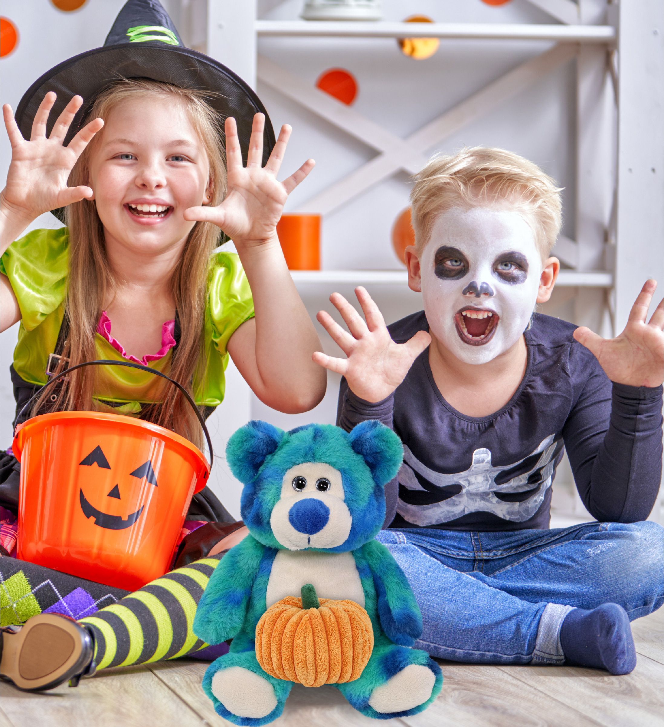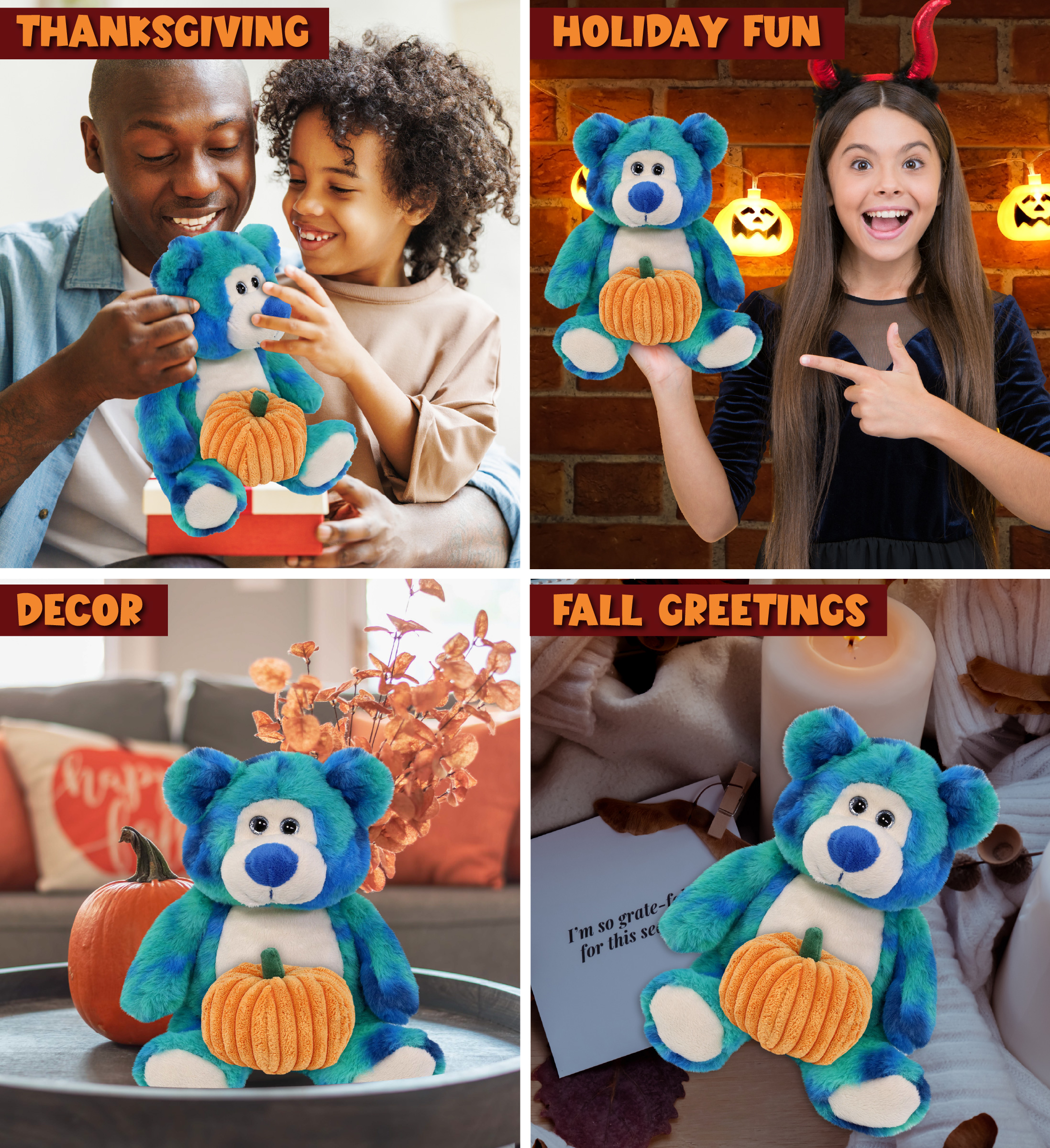 - The Bear Plush Pumpkin Stuffed Animal Is for Everyone Who Loves Halloween Toys – The Blue Tie-Dye Bear stuffed animal pumpkin plush toy designed with fall plush theme makes for sweet Halloween kids gifts, babys first Halloween gift and Thanksgiving gifts for friends and family. Welcome spooky month and share the fun of trick-or-treating with loved ones by gifting them a cute custom stuffed animal bear plush doll with a pumpkin soft toy.