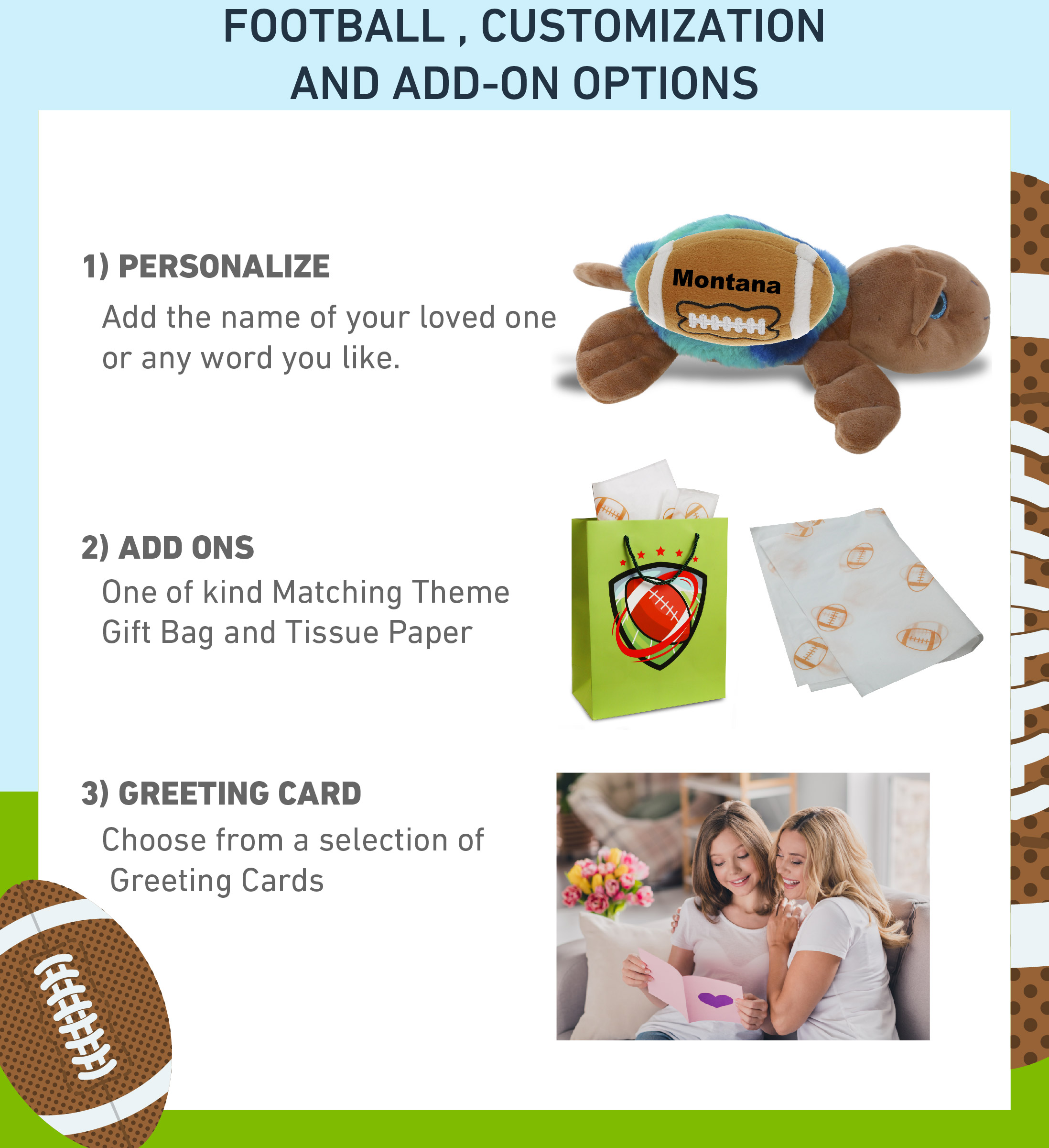 - Personalization, Customization, and Add-On Options – This Super Soft Sports Stuffed Animal Blue Tie-Dye Brown Sea Turtle Plush comes customized with a football plush. You can personalize it with the name of your loved one imprinted on the item. You also have the option to add some or all of the cool add-ons to make your gift extra special: 1) Gift Bag; 2) Tissue Paper; 3) Greeting Card.