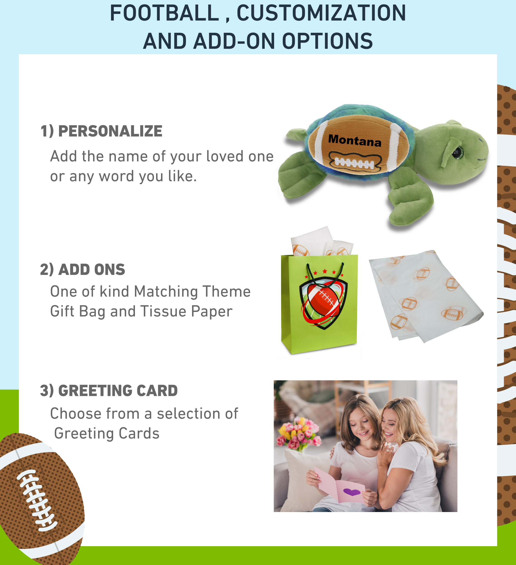- Personalization, Customization, and Add-On Options – This Super Soft Sports Stuffed Animal Blue Tie-Dye Green Sea Turtle Plush comes customized with a football plush. You can personalize it with the name of your loved one imprinted on the item. You also have the option to add some or all of the cool add-ons to make your gift extra special: 1) Gift Bag; 2) Tissue Paper; 3) Greeting Card.