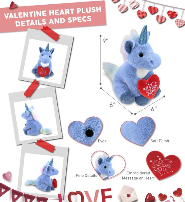 - INLUDED WITH THE PURCHASE OF VALENTINE PLUSH – Includes 1 DolliBu Super Soft Blue Unicorn Valentines Day Stuffed Animal Plush with a romantic message embroidered on the red stuffed heart plush. Make this Valentine’s Day plush a sweet stuffed animal Valentine gift for boyfriend or girlfriend. husband, wife, or a cute unicorn plush surprise for your kids who love playing with stuffed unicorns. The stuffed unicorn plush measures 6LX6WX9H inches.