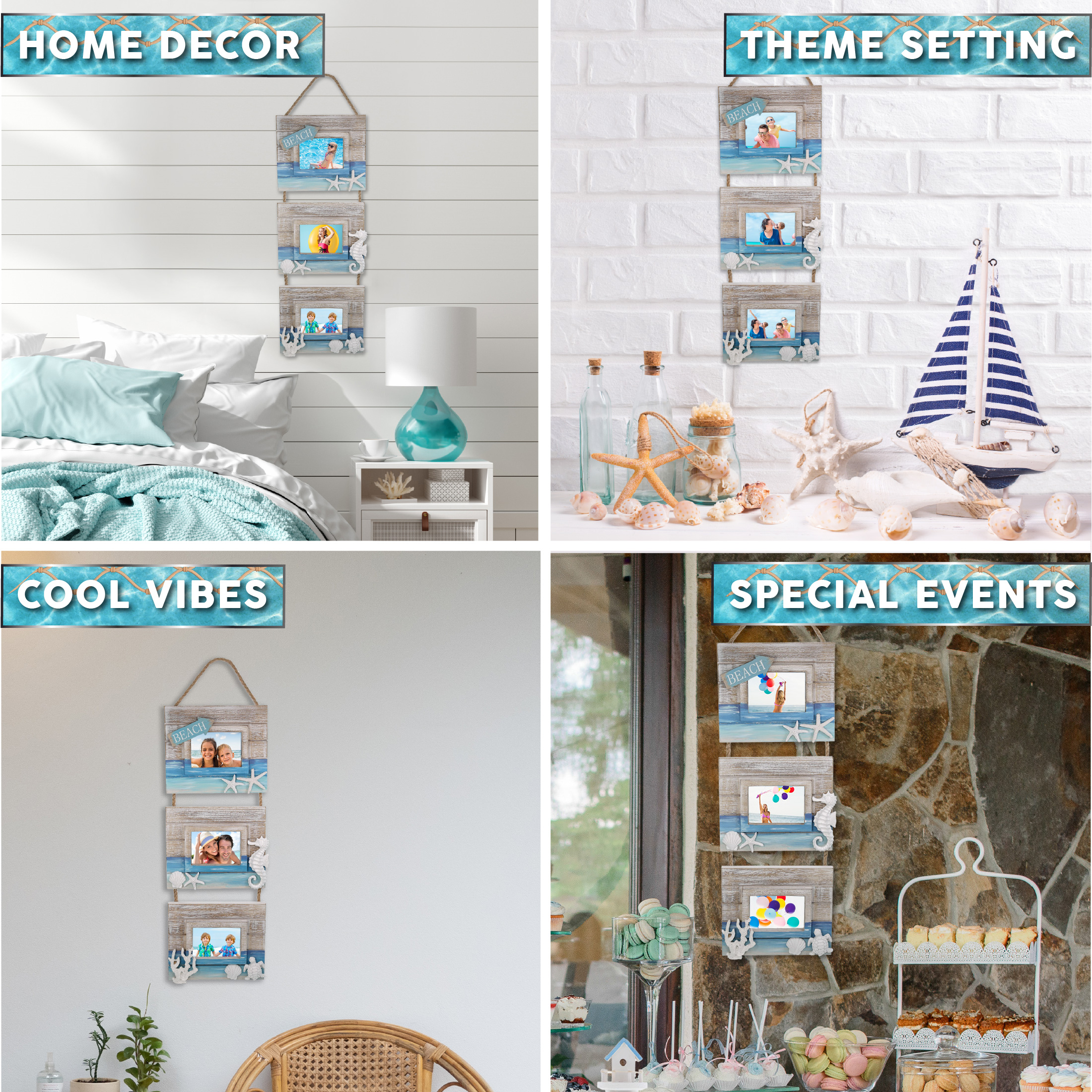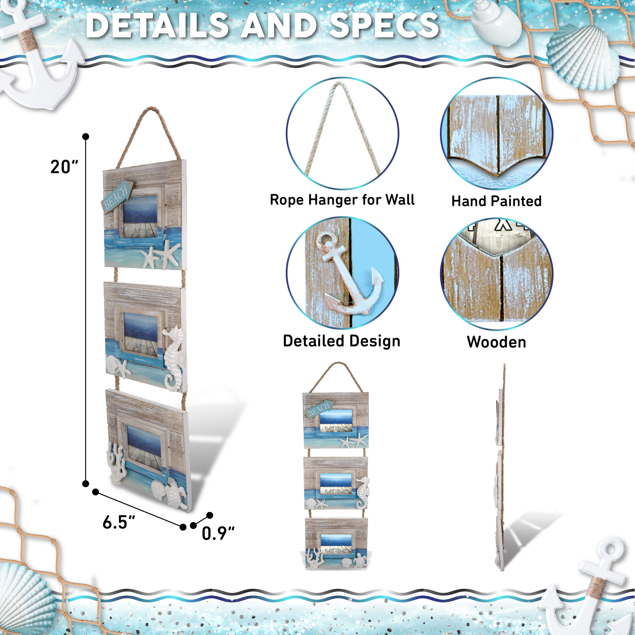 - Included with the Purchase of 3.5×2.5 Beach Picture Frames – Includes 1 CoTa Global Blue Wave Hanging Frames with three windows for photos of 3.5×2.5 in size. Perfectly designed with ocean figures and beachy theme to match your beach themed picture frames. The 3.5×2.5 family photo frames design makes a cute picture frame for room decor or distressed wood photo frame to preserve your summer photos. The beach frames measures 20Lx6.15Wx0.9D inches.