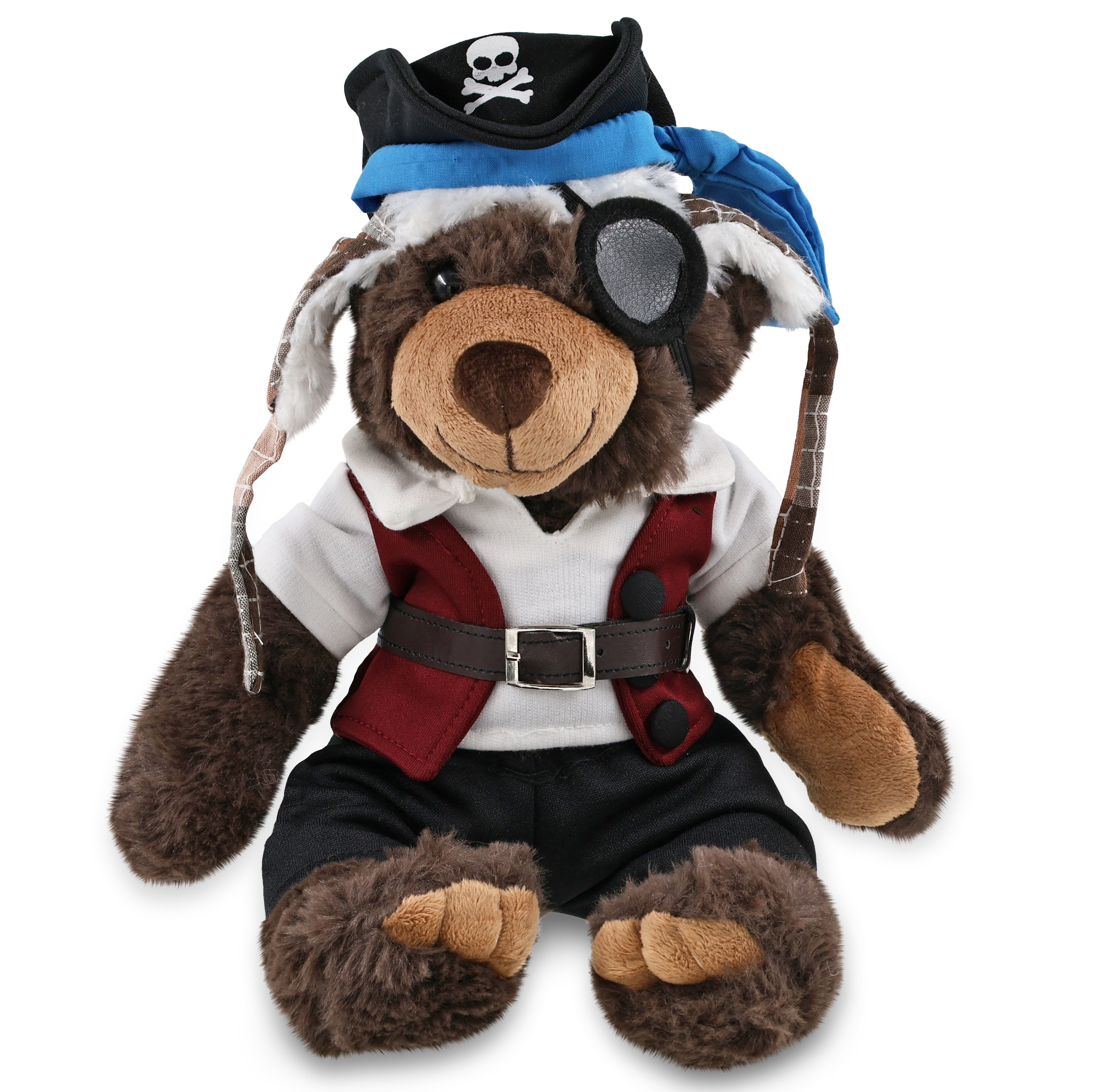 - The Pirate-Themed Brown Bear with Clothes Stuffed Animal Features a Fun Mix of Pirate Vibes and Classic Bear – Making it both quirky and lovable. It comes with a complete head-to-toe pirate teddy bear outfits, featuring a hat with skull print and a blue bandana, a red vest, black pants, brown belt, white shirt, and an eye patch, making your cute brown bear a complete pirate, ready for some wild animal sea pirate adventure