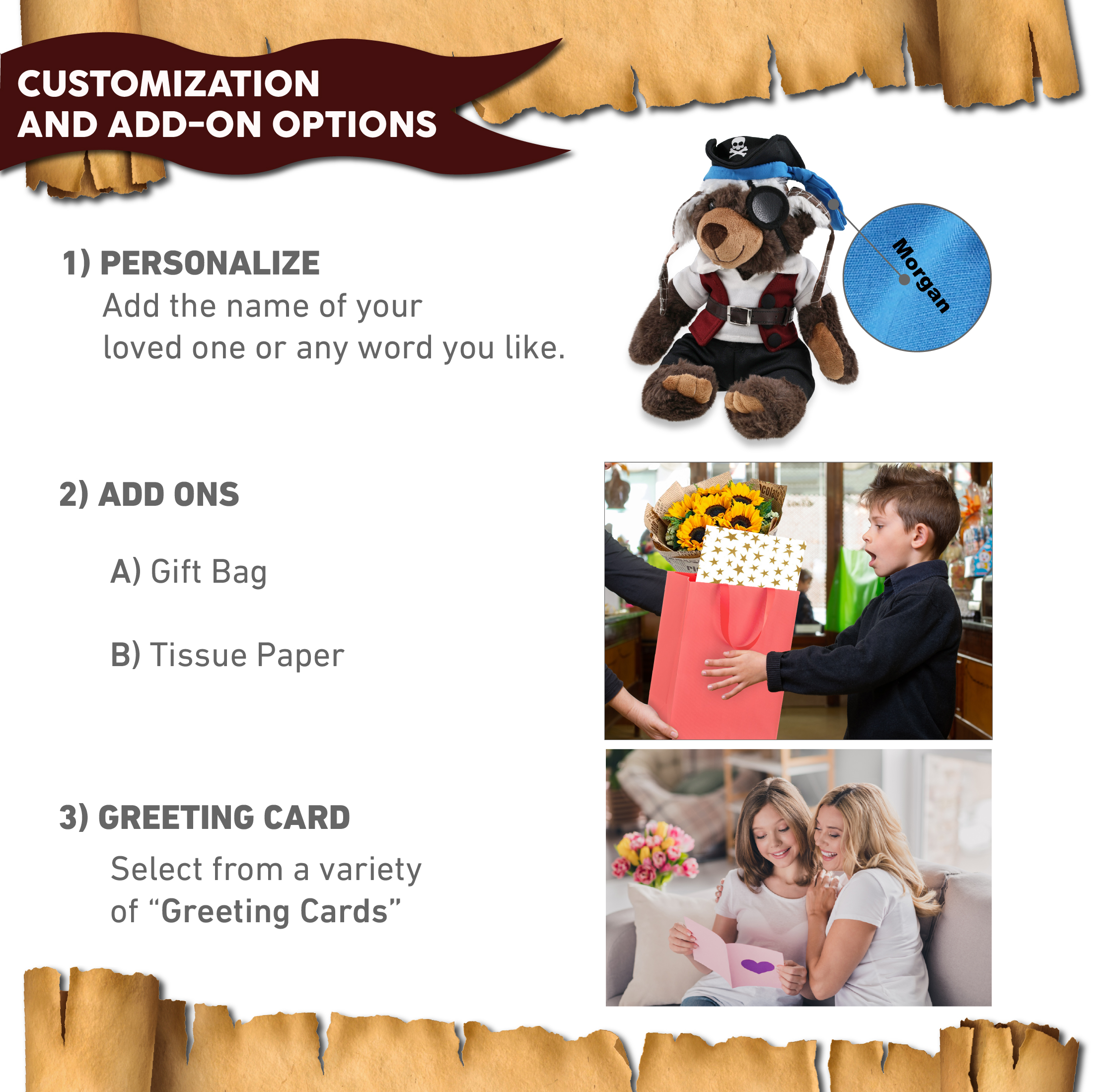 - Personalization, Customization, and Add-On Options – The brown bear figure stuffed toy comes dressed in full pirate clothes, complete with pirate hat, pirate vest, pirate shirt, pants, belt, and pirate mask. Make your bear doll special by adding a personalized name, which we will imprint onto the plush. You can also customize your stuffed animal by adding any of our add-ons to create the perfect gift: 1) Gift Bag 2) Tissue Paper 3) Greeting Card.