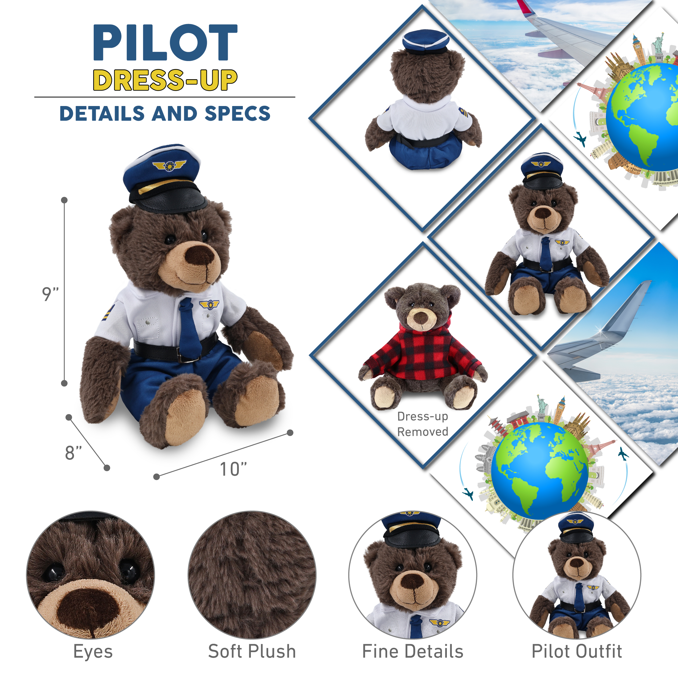 - Features a Cute Teddy Bear Plush with Pilot Uniform Costume – This bear doll features ready-to-fly pilot clothes for teddy bears. The bear plush features cool details like its ears and fluffy brown plush, while the pilot career dress up costume features a white button-up aviation uniform shirt with printed pilot wings and sleeve stripes, blue pants with an elastic waistband, a black belt, a matching blue tie, and a classic pilot captain hat.