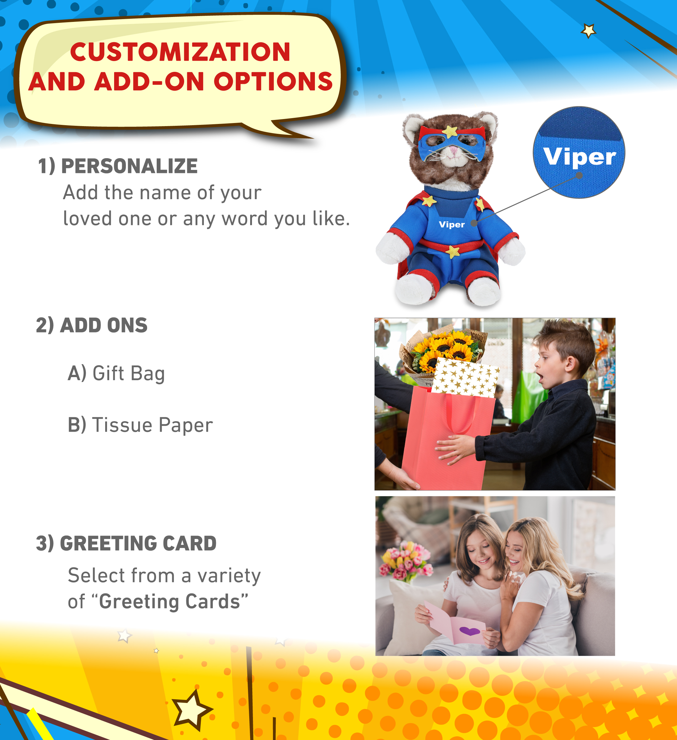 • Personalization, Customization, and Add-On Options – The cat stuffed toy comes dressed in a full superhero outfit, complete with an eye mask, cape, and star details. Make your cat doll special by adding a personalized name, which we will imprint onto the plush. You can also customize your cat plush hero toy by adding any of our add-ons to create the perfect gift: 1) Gift Bag 2) Tissue Paper 3) Greeting Card.