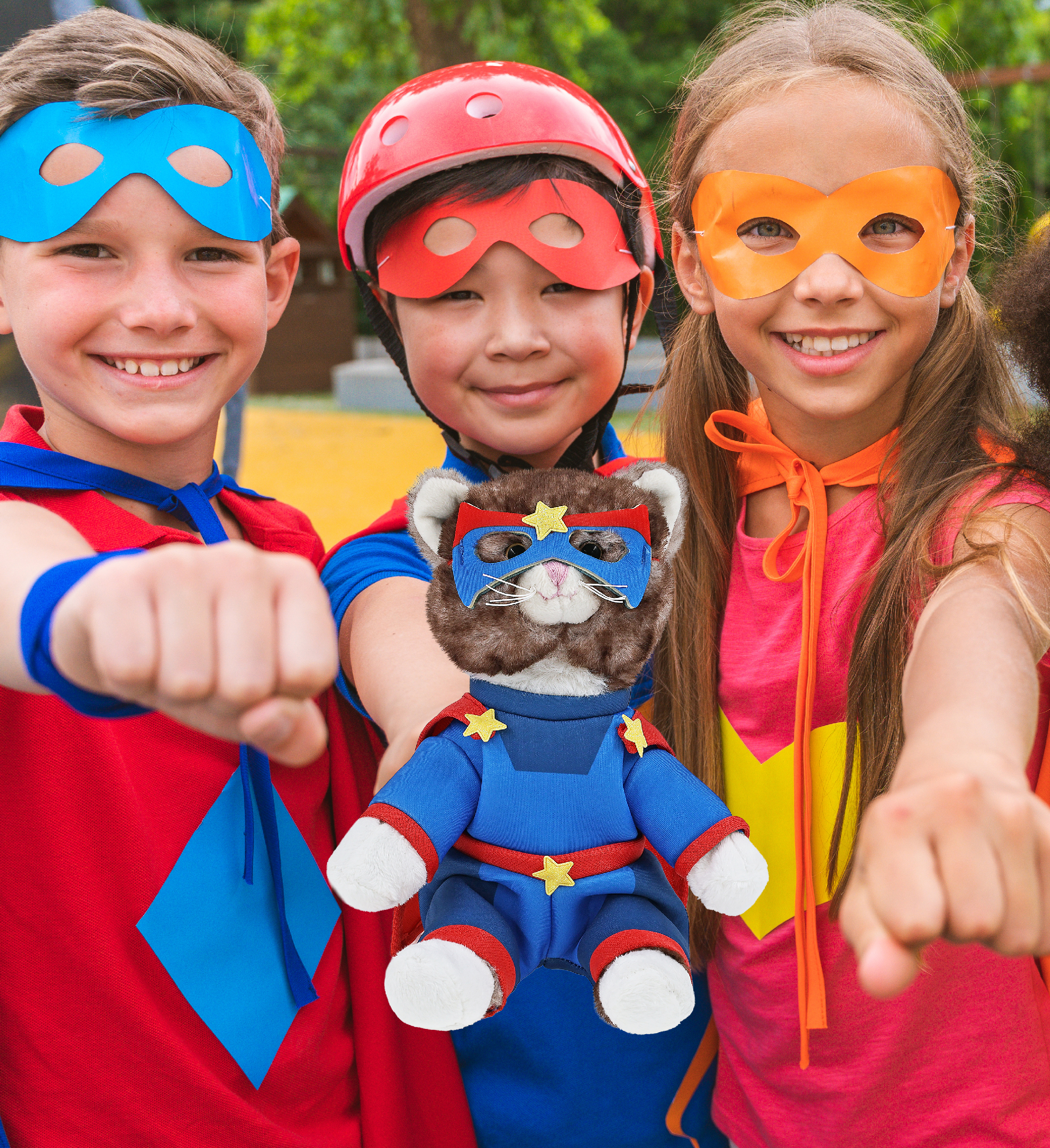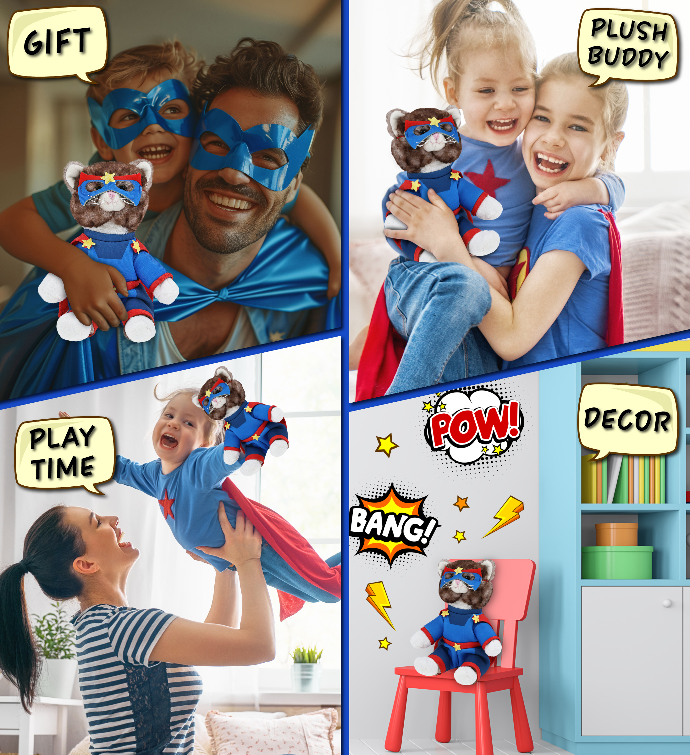 • Features a Teddy Bear Brown Cat Wearing Superhero Stuffed Animal Clothing – With a mask, suit, and cape, this cat stuffed plush toy comes with a playful and stylish look that results in two fun themes: pets and superheroes! Whether you’re searching for super heroes plush toys, stuffed animal outfits, or cat figures with personality, this cute plush cat adds charm to any toy shelf, room décor, or Halloween plush collection.