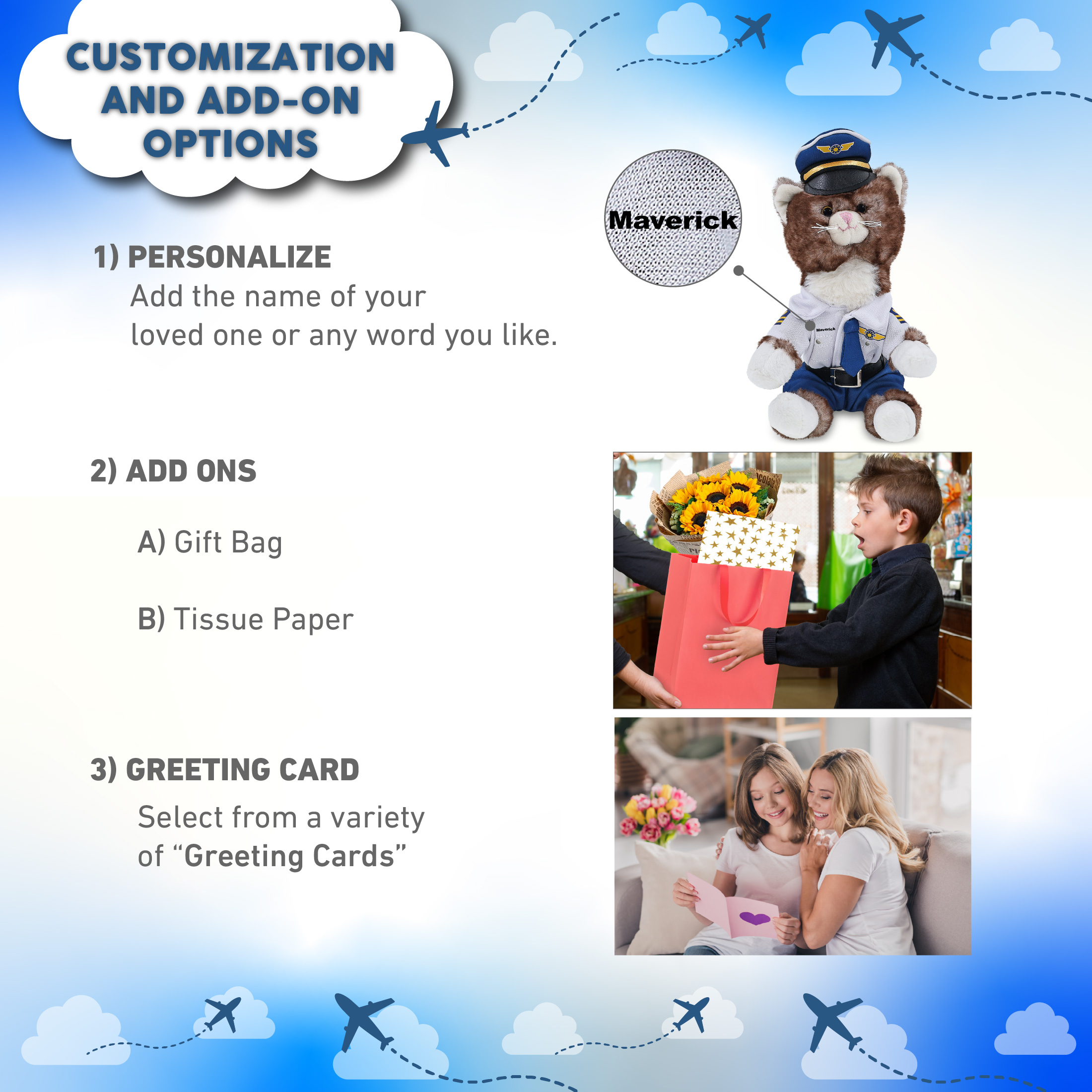 - Personalization, Customization, and Add-On Options – The brown cat stuffed animal comes dressed in a full pilot outfit set, with a white pilot shirt, captain hat, belt, and pants. Make your pilot stuffed bear special by adding a personalized name, which we will imprint onto the plush. You can customize your plush pilot toy by adding any of our add-ons to create the perfect gift: 1) Gift Bag 2) Tissue Paper 3) Greeting Card.