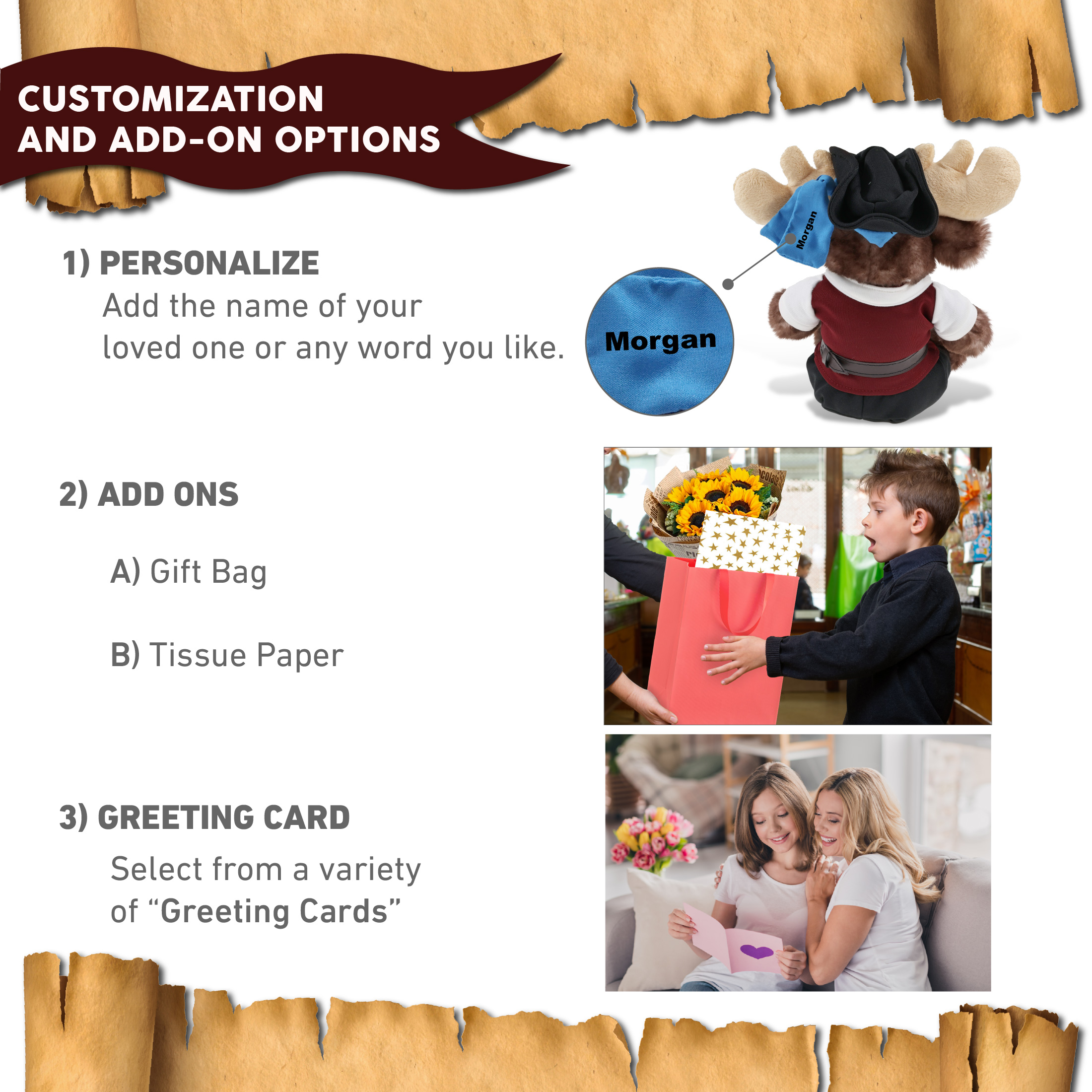 - Personalization, Customization, and Add-On Options – The moose figure stuffed toy comes dressed in full pirate clothes, complete with pirate hat, pirate vest, pirate shirt, pants, belt, and pirate mask. Make your bear doll special by adding a personalized name, which we will imprint onto the plush. You can also customize your stuffed animal by adding any of our add-ons to create the perfect gift: 1) Gift Bag 2) Tissue Paper 3) Greeting Card.