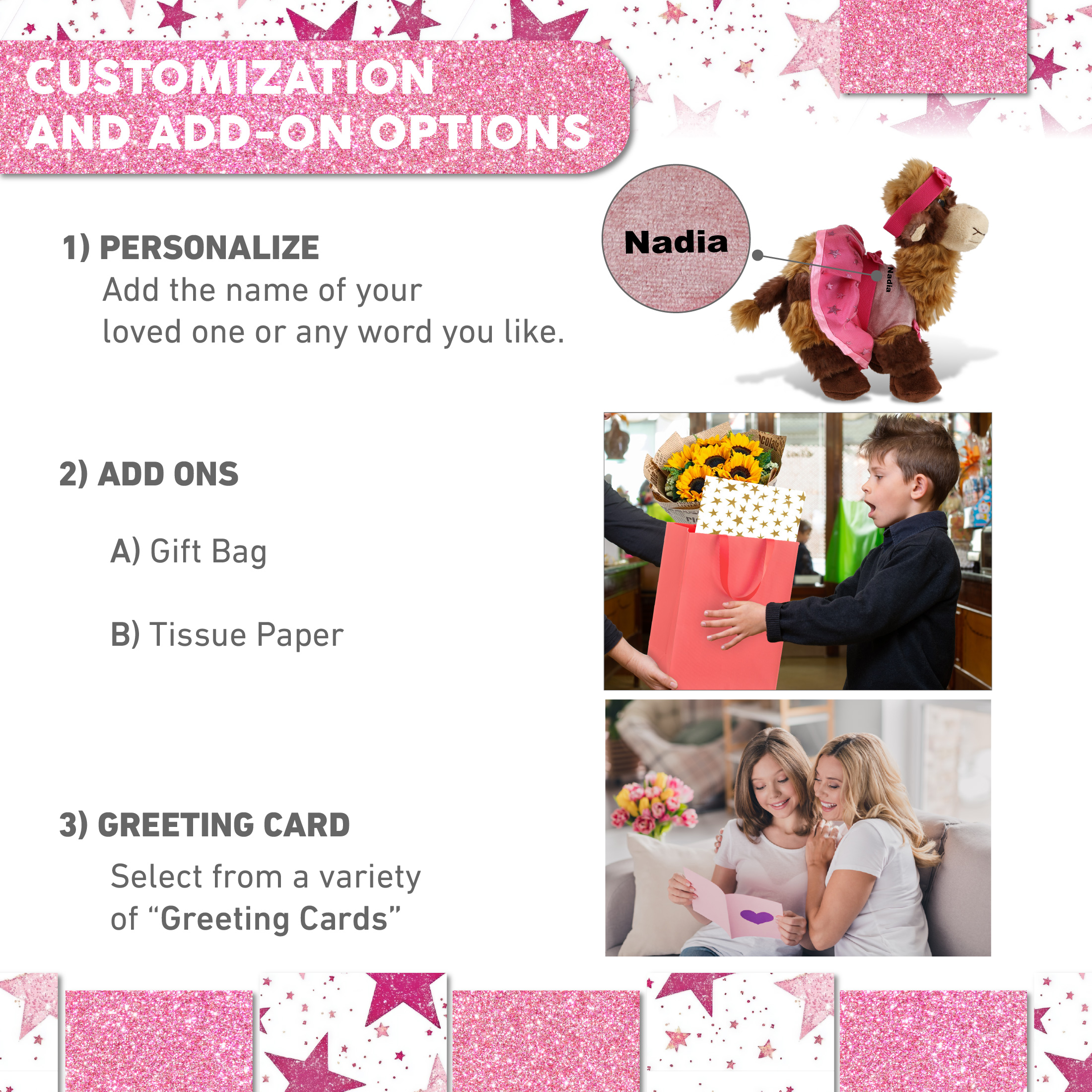 - Personalization, Customization, and Add-On Options – The camel plush toy comes dressed in a charming pink ballerina outfit, complete with tutu skirt, headband, and shirt. Make it meaningful by personalizing it with the name, which we will imprint directly onto the plush. You can also customize your ballerina camel stuffed animal doll by adding any of our add-ons to create the perfect gift: 1) Gift Bag 2) Tissue Paper 3) Greeting Card.