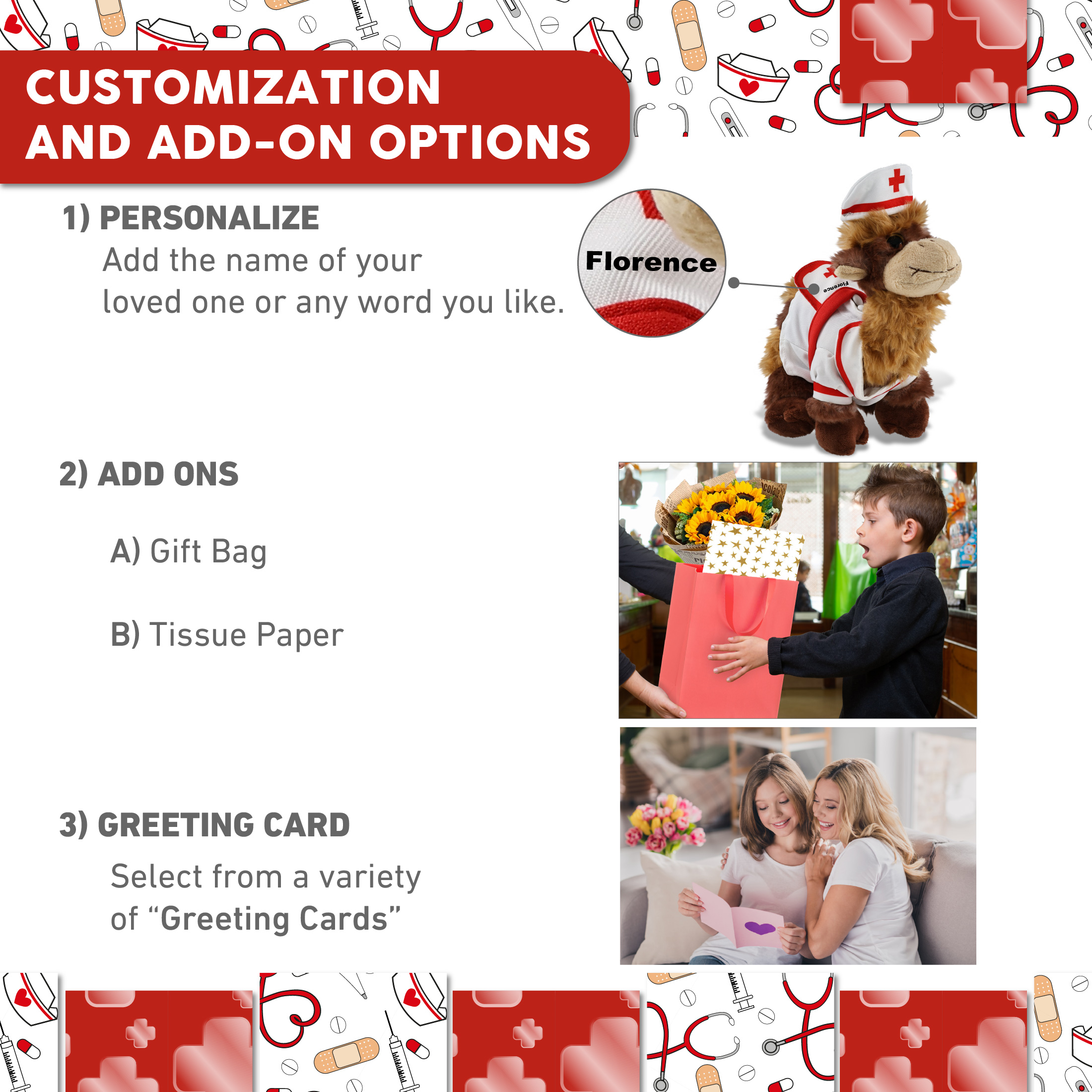 • Personalization, Customization, and Add-On Options – The stuffed Camel comes dressed in a cute nurse costume, complete with nurse cap, nurse dress and apron. Make your nurse teddy bear stuffed animal plush special by adding a personalized name, which we’ll imprint onto the plush. You can also customize your nurse camel plush by adding any of our add-ons to create the perfect gift: 1) Gift Bag 2) Tissue Paper 3) Greeting Card.