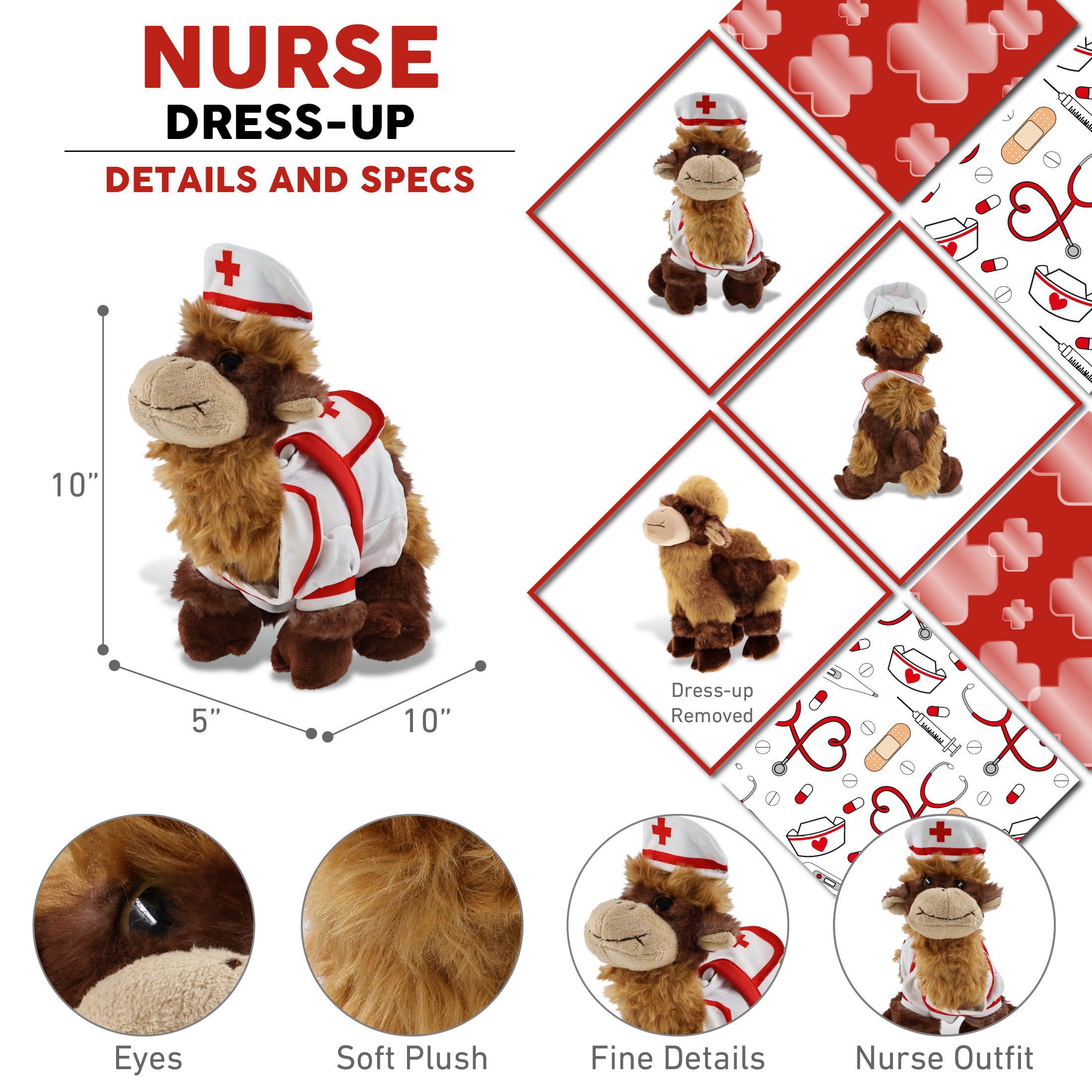 DolliBu Camel Plush with Nurse Stuffed Animal Dress Up Set – Hospital Costume Camel Stuffed Toy with Nurse Dress, Hat, and Apron, Get Well Plush with Name Personalization – 10 Inches