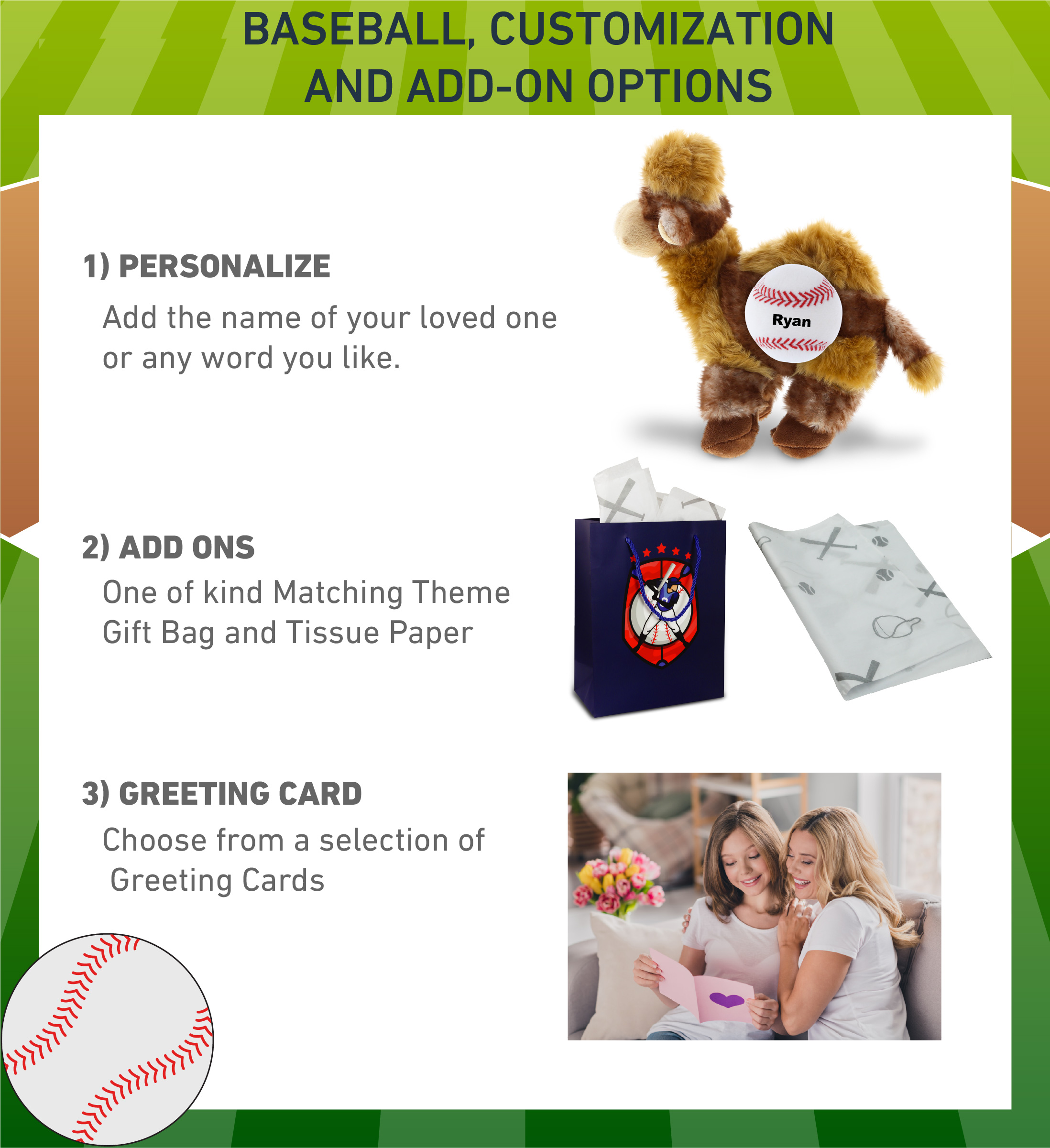 - Personalization, Customization, and Add-On Options – The Super Soft Sports Stuffed Animal Camel comes customized with a small baseball plush. You can personalize your stuffed animal camel with the name of your loved one which we will imprint on the item. You also have the option to add some or all of the cool add-ons to make your gift extra special: 1) Gift Bag; 2) Tissue Paper; 3) Greeting Card.