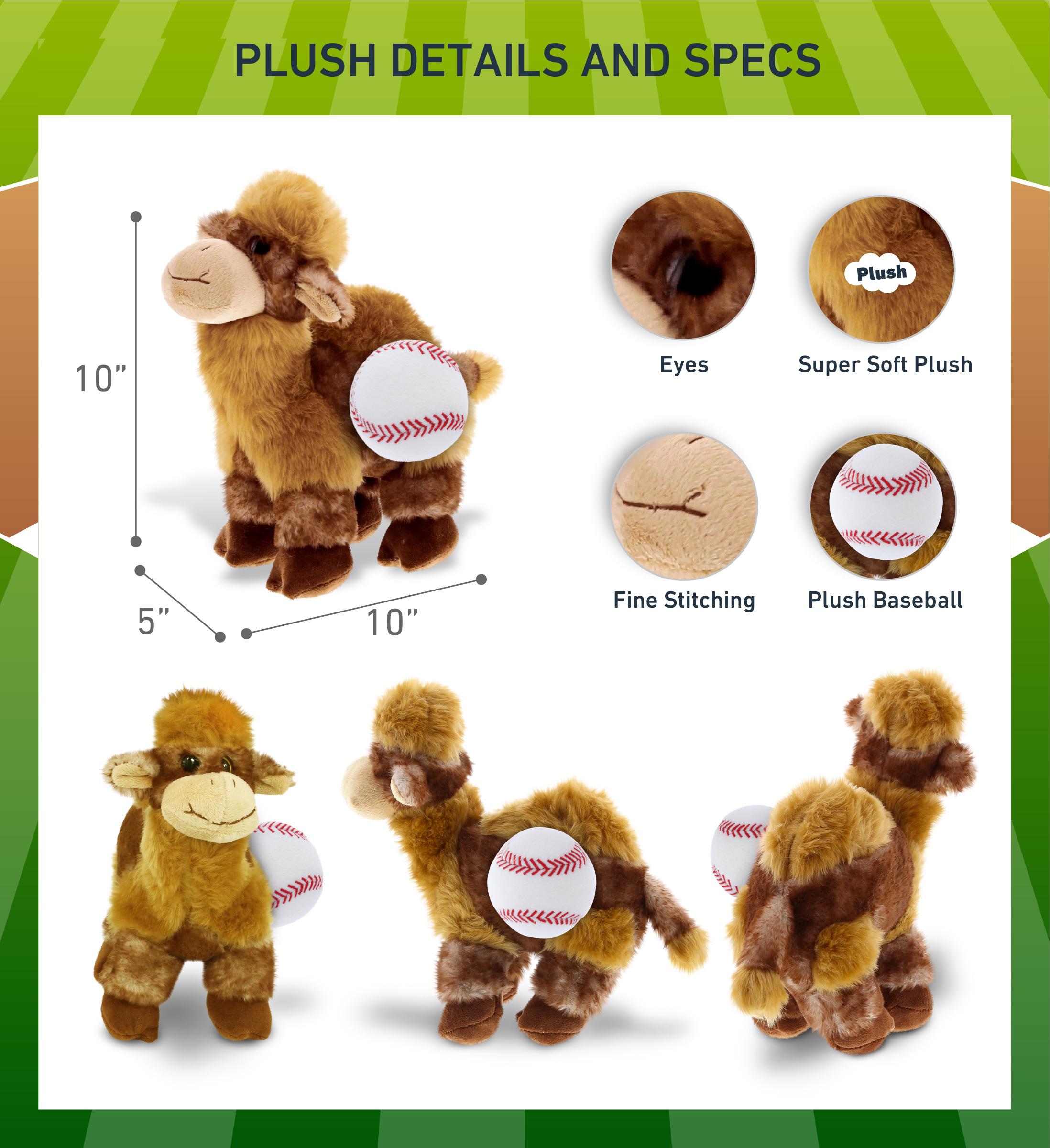 - Included with The Purchase of Camel Plush with Baseball Ball – Includes 1 DolliBu Camel Super Soft Stuffed Animal with a baseball plush, decorated with realistic features of a camel. The baseball sports ball is attached to the camel’s body, making it perfect for cuddles. The camel plush toy features realistic details. The camel’s eyes make the critter so charming. The cute plush toy buddy measures 10Lx5Wx10H inches.