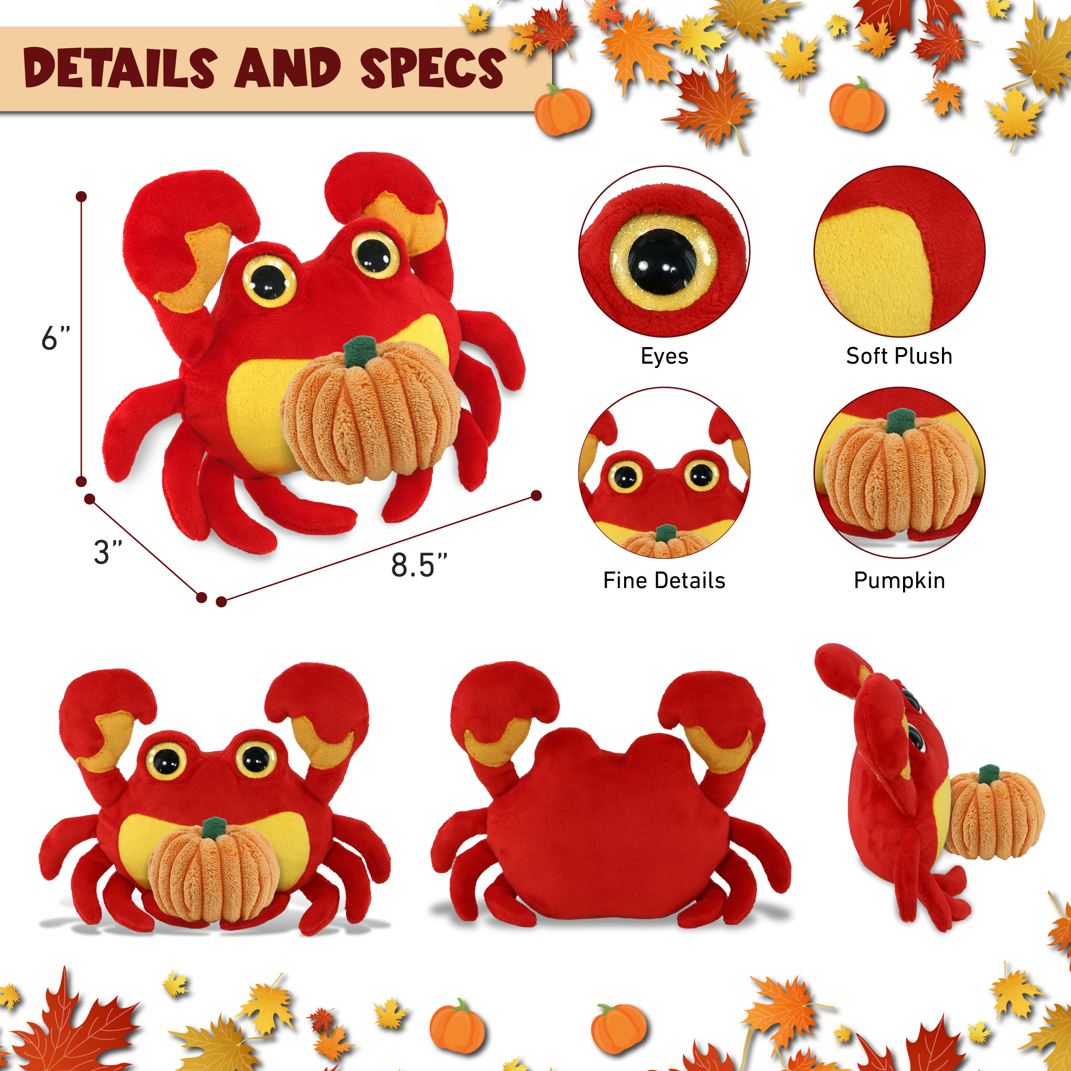 - Included in the Purchase of the Pumpkin Stuffed Crab Plush – Includes 1 DolliBu Big Eye Plush Crab Stuffed Animal Plush to celebrate fall season. The crab features realistic details, and an orange plush pumpkin decor toy on the plush crab animals front. Decorated with unique red plush, realistic design, and soft fabric, it is perfect for cuddles and snuggles. The crab plush animal measures 8.5Lx3Wx6H inches.