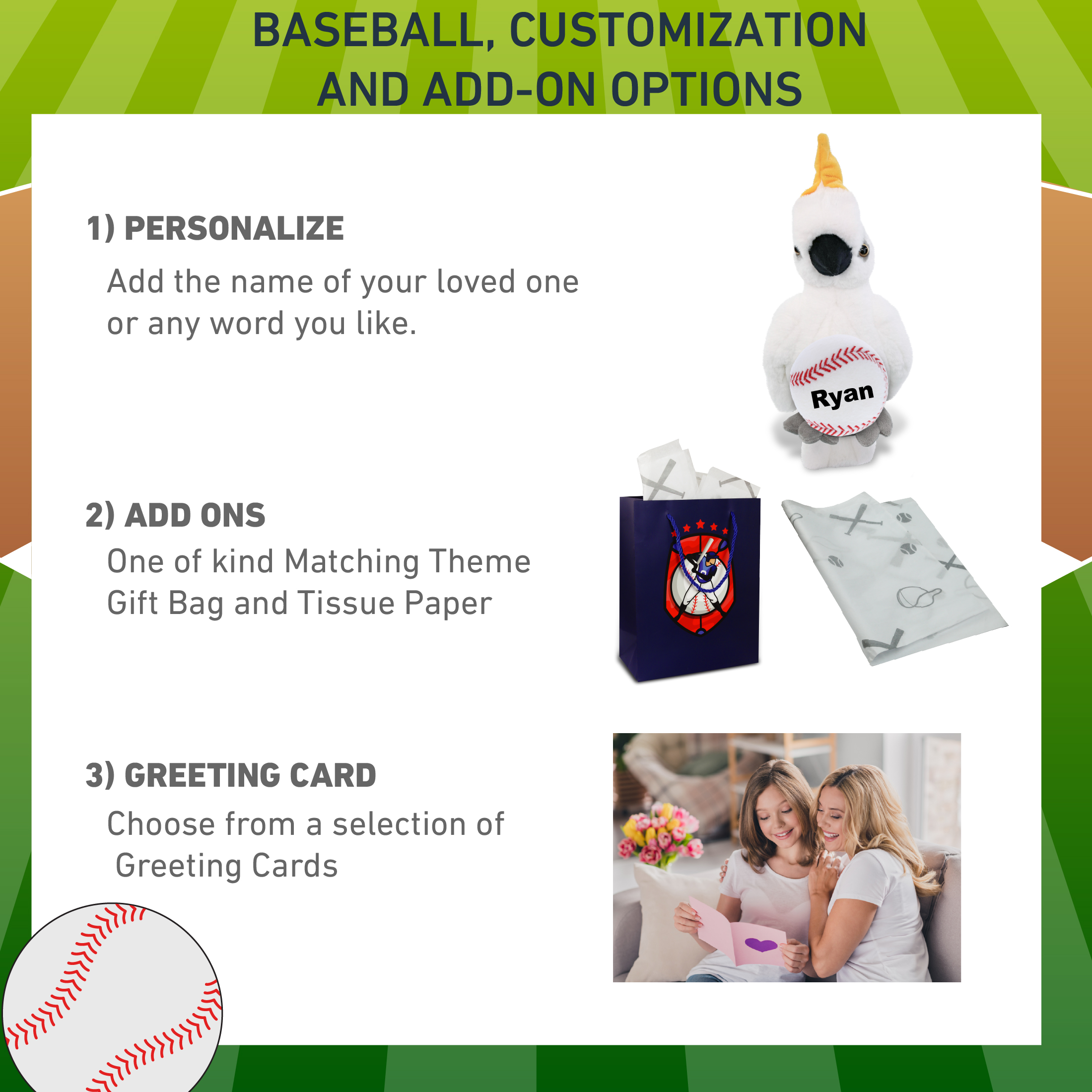 - Personalization, Customization, and Add-On Options – The Super Soft Sports Stuffed Animal Cockatoo comes customized with a small baseball plush. You can personalize your stuffed animal cockatoo with the name of your loved one which we will imprint on the item. You also have the option to add some or all of the cool add-ons to make your gift extra special: 1) Gift Bag; 2) Tissue Paper; 3) Greeting Card.