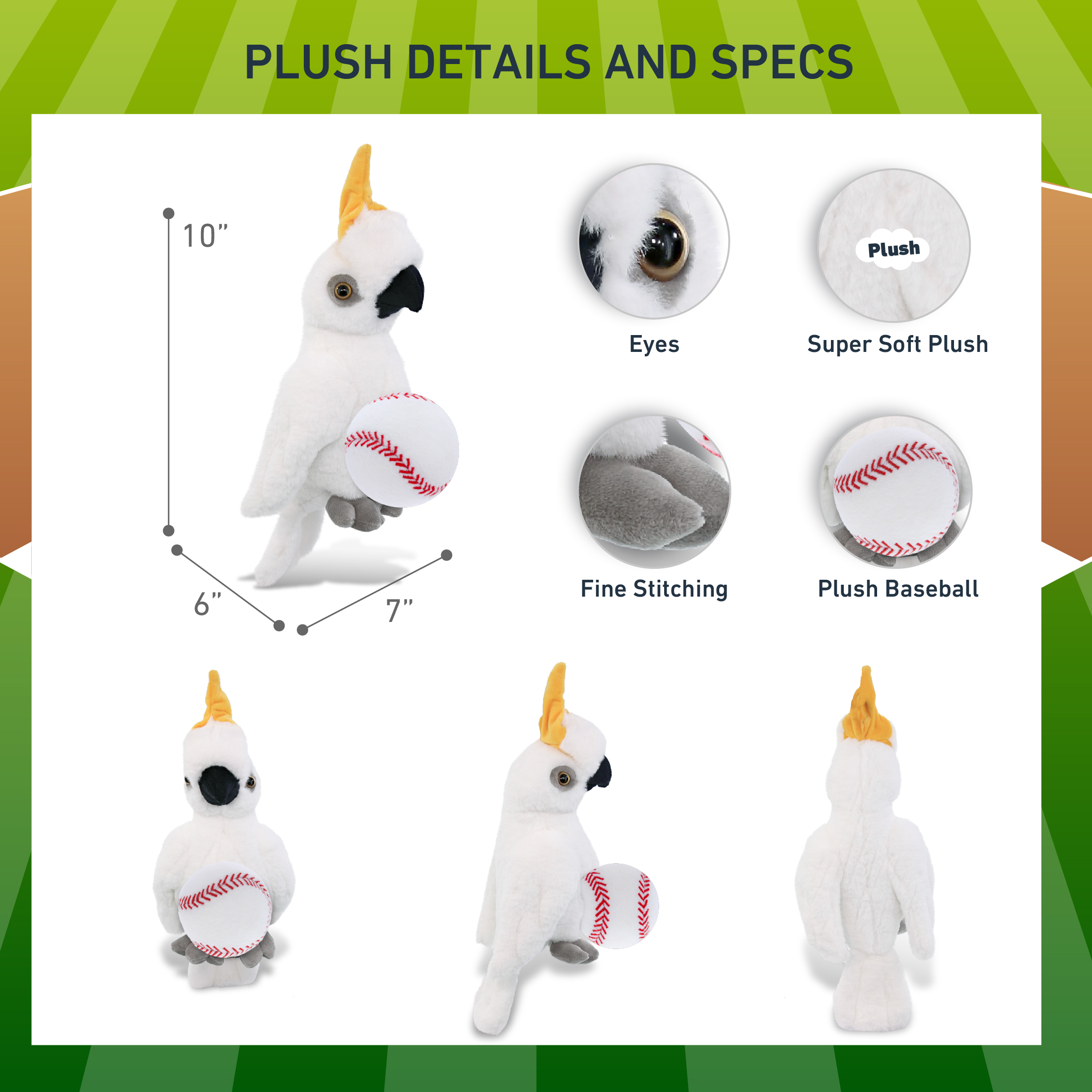- Included with The Purchase of Cockatoo Plush with Baseball Ball – Includes 1 DolliBu Cockatoo Super Soft Stuffed Animal with a baseball plush, decorated with realistic features of a cockatoo. The baseball sports ball is attached to the cockatoo’s body, making it perfect for cuddles. The cockatoo plush toy features realistic details. The cockatoo’s eyes make the critter so charming. The cute plush toy buddy measures 7Lx6Wx10H inches.