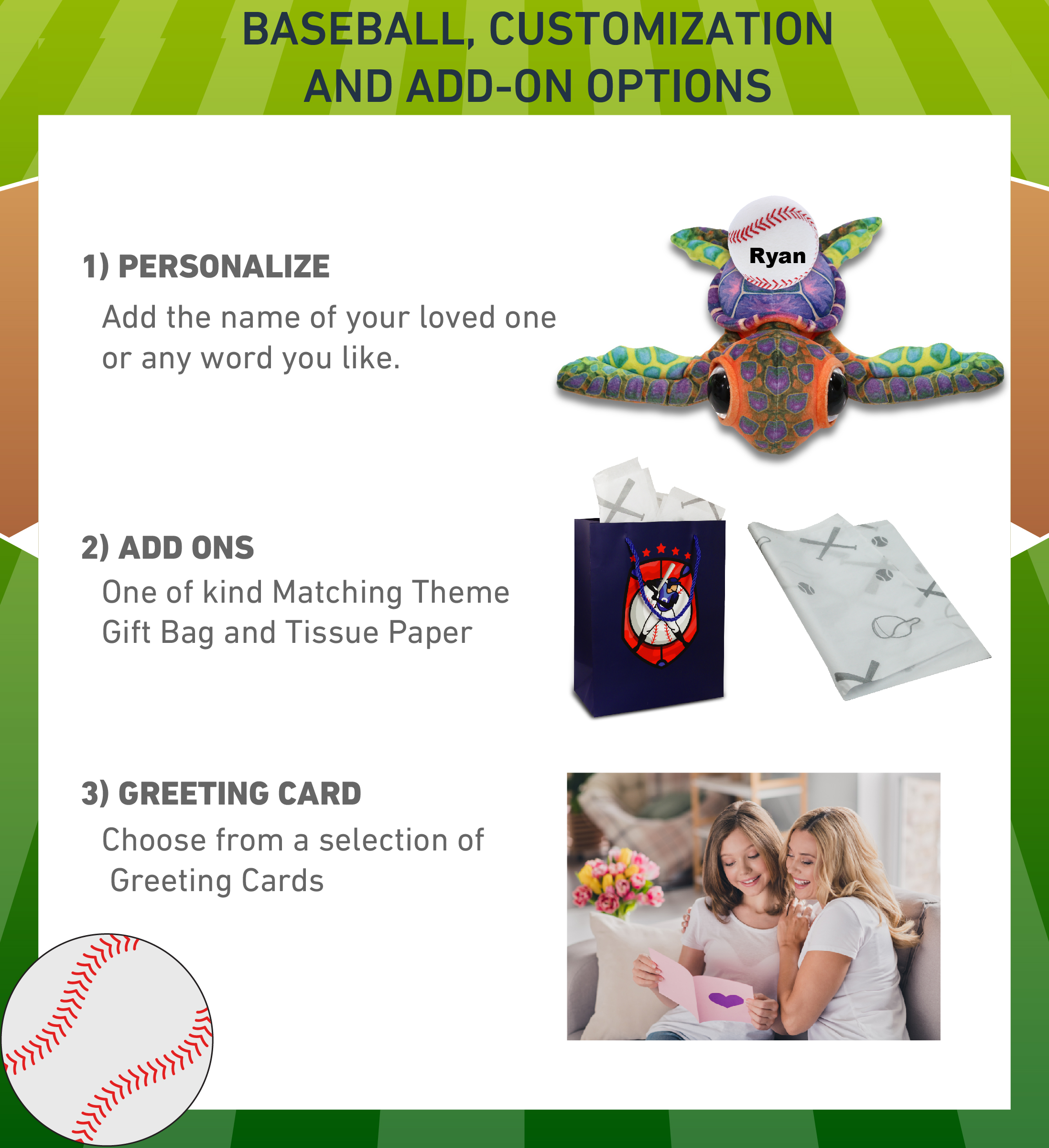 - Personalization, Customization, and Add-On Options – The Super Soft Sports Stuffed Animal Colorful Sea Turtle comes customized with a small baseball plush. You can personalize your stuffed animal turtle with the name of your loved one which we will imprint on the item. You also have the option to add some or all of the cool add-ons to make your gift extra special: 1) Gift Bag; 2) Tissue Paper; 3) Greeting Card.
