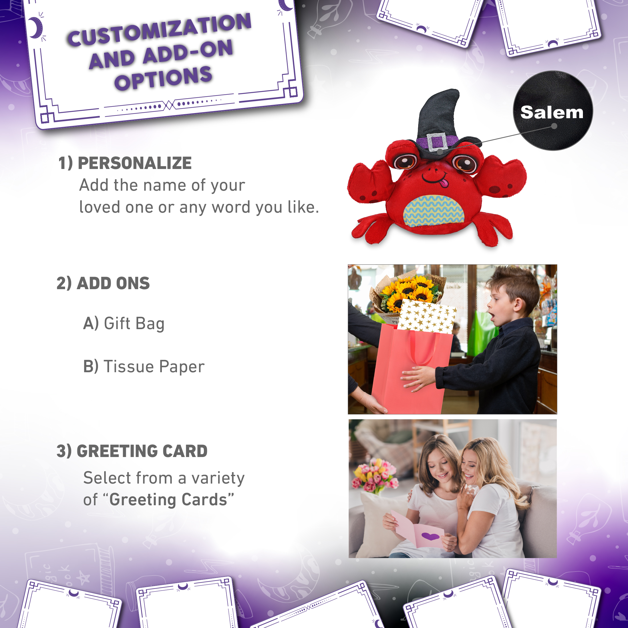- Personalization, Customization, and Add-On Options – The crab Halloween plush toy comes dressed in a witch outfit, complete with a pointy black witch hat. Make your teddy bear doll special by adding a personalized name, which we will imprint onto the plush. You can also customize your witch crab stuffed animal by adding any of our add-ons to create the perfect gift: 1) Gift Bag 2) Tissue Paper 3) Greeting Card.
