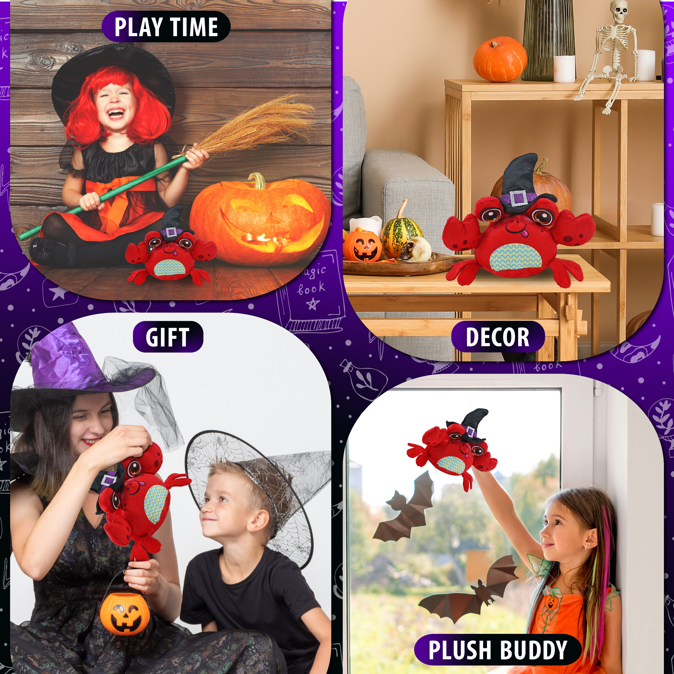 - Includes 1 DolliBu Plush Buddies Crab Toy Dressed in Witch Costume – The plush crab arrives with a witch stuffed animal outfit hat. The witch stuffed crab toy features a black witch dress up set hat with intricate purple details. The perfect crab plush to add spooky vibes to a display, along with your other Halloween stuffed animals. A cute stuffed animal crab that measures 8Lx4.5Wx3H inches and is perfect for 3 years and up.