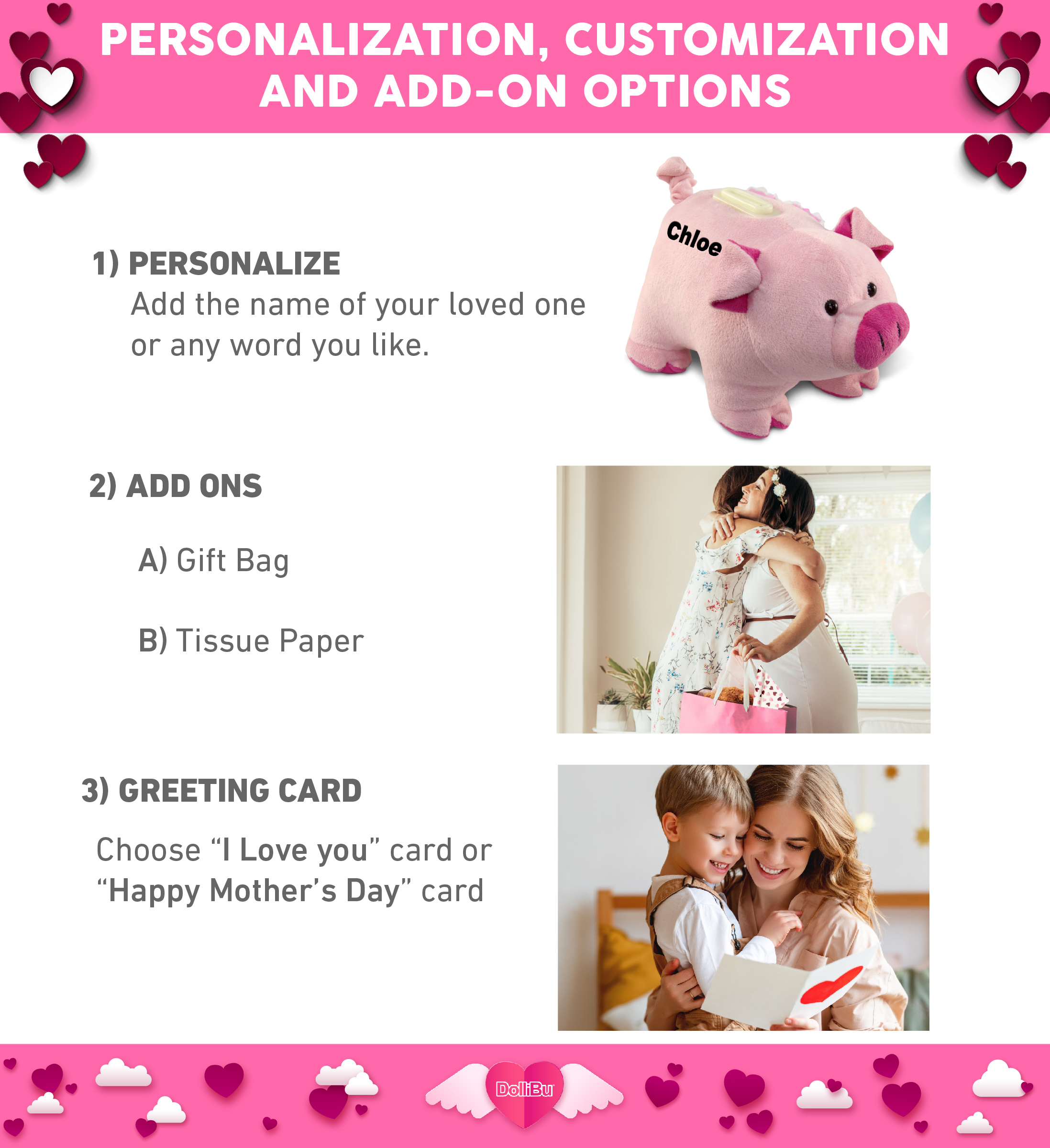 - THE SUPER SOFT PLUSH BANK PIG STUFFED ANIMAL WITH A HEART COMES WITH UNIQUE DESIGN YOU WILL LOVE ? Pig Plush Bank comes customized with a beautiful “Happy Mother’s Day” message embroidered on a Pink Plush Heart. DolliBu’s Mother’s Day Super Soft Plush Bank Pig makes a sweet present for anyone who loves stuffed toys and farm animals. A must-have animal plush gift to celebrate and make your mom feel special on Mother’s Day.