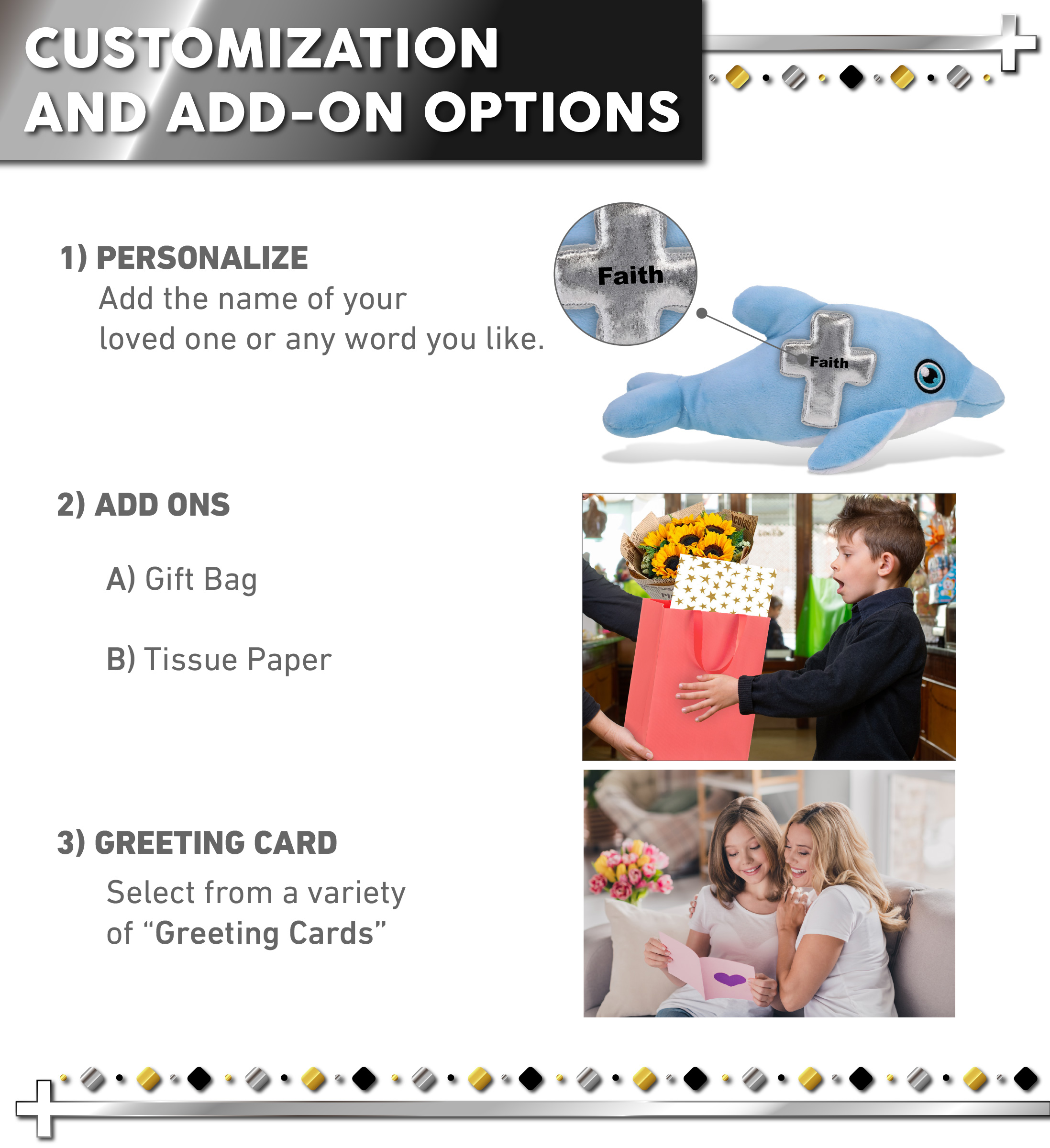 - Personalization, Customization, and Add-On Options – Super Soft Eco-Friendly Dolphin stuffed animal bear comes customized with a shiny metallic cross. You can turn it into a personalized teddy bear with the name of a loved one, or add any word which we will imprint on the item. And last, you have the option to add some or all of the cool add-ons to make your gift extra special: 1) Gift Bag 2) Tissue Paper 3) Greeting Card.