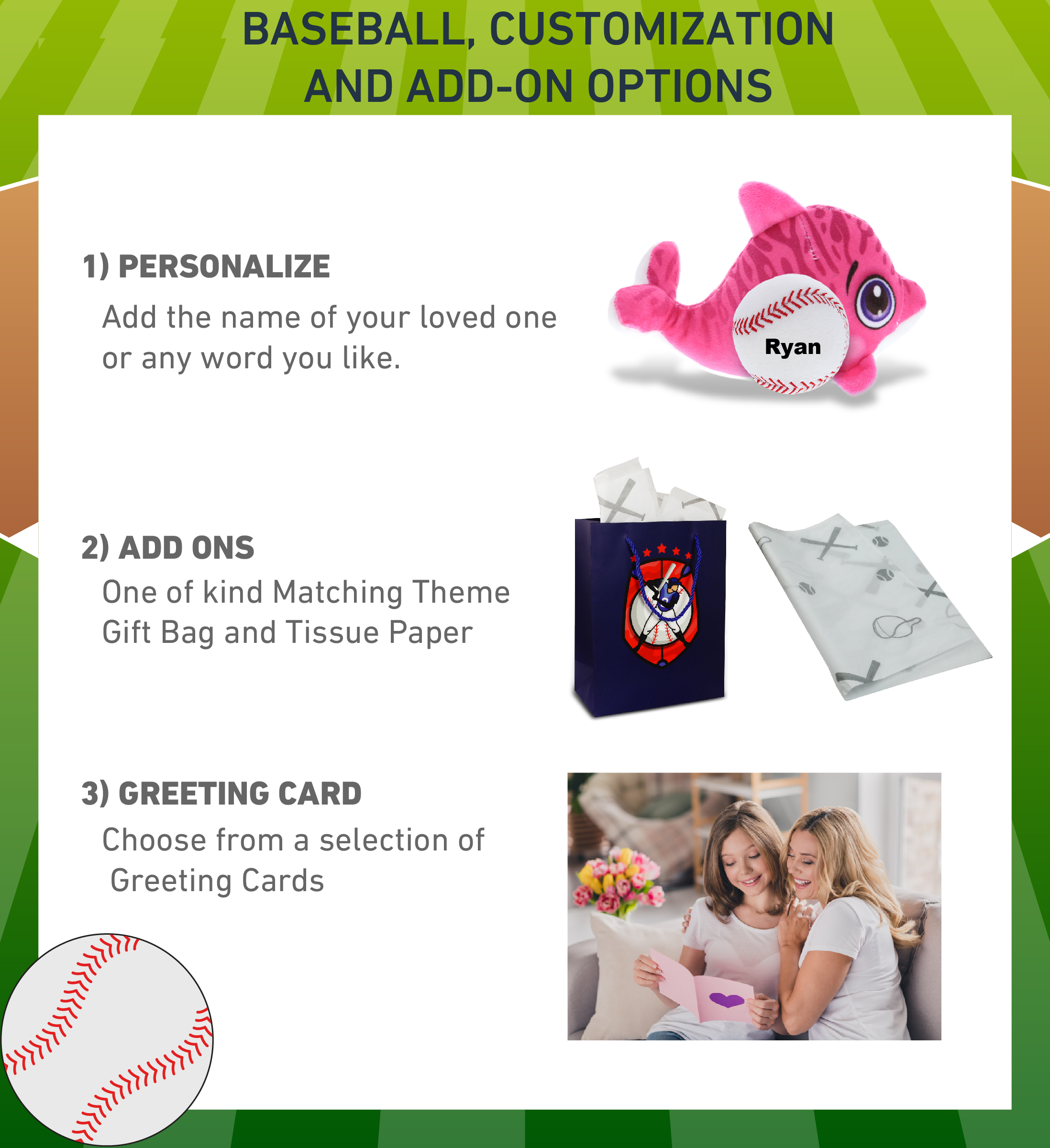 - Personalization, Customization, and Add-On Options – The Plush Buddies Sports Stuffed Animal Dolphin comes customized with a small baseball plush. You can personalize your stuffed animal dolphin with the name of your loved one which we will imprint on the item. You also have the option to add some or all of the cool add-ons to make your gift extra special: 1) Gift Bag; 2) Tissue Paper; 3) Greeting Card.