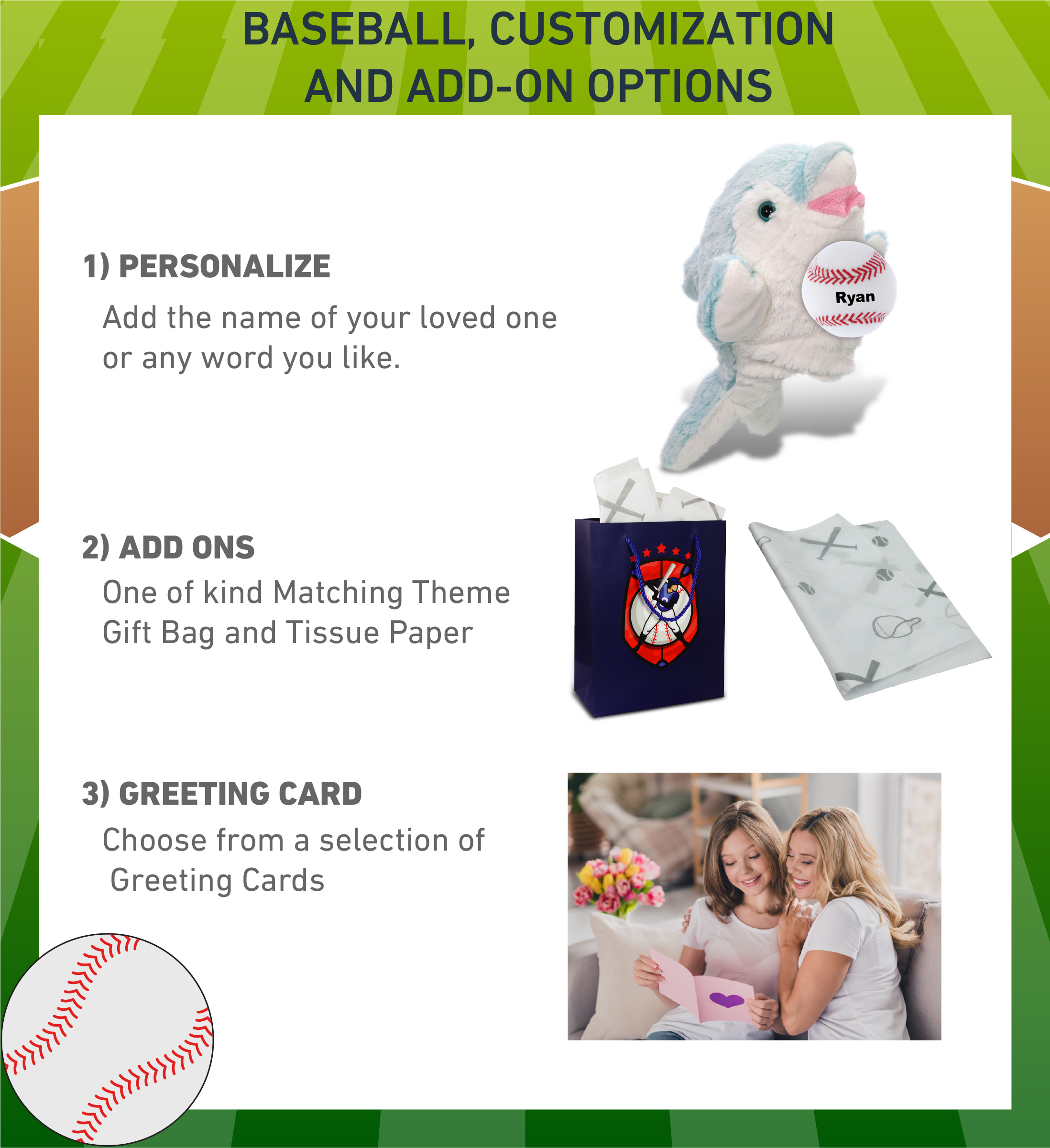 • Personalization, Customization, and Add-On Options – The Super Soft Sports Stuffed Animal Dolphin Plush Hand Puppet comes customized with a small baseball plush. You can personalize your stuffed animal dolphin with the name of your loved one which we will imprint on the item. You also have the option to add some or all of the cool add-ons to make your gift extra special: 1) Gift Bag; 2) Tissue Paper; 3) Greeting Card.