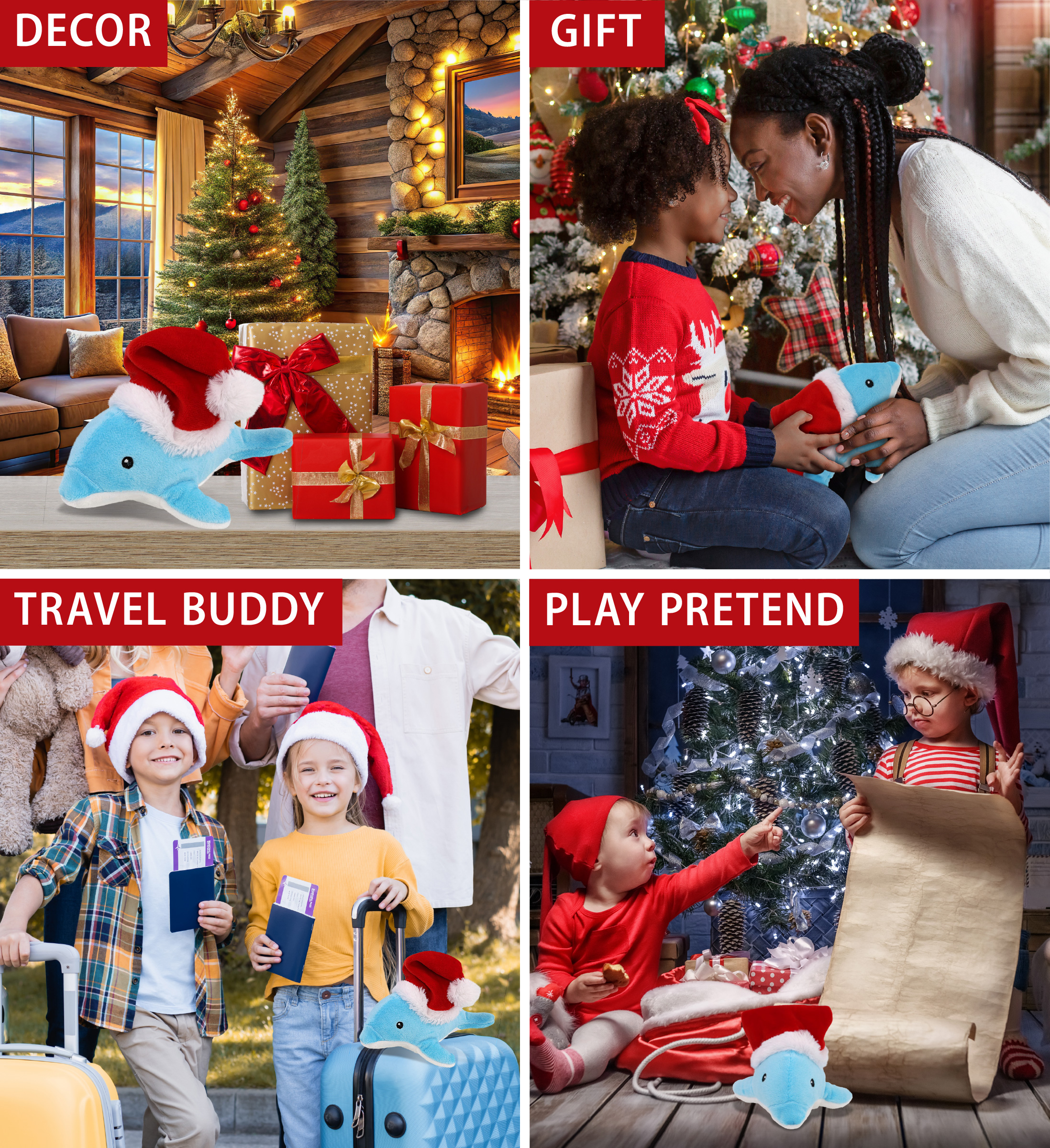 - Ideal Use for the Dolphin Santa Claus Stuffed Animal – Send your warmest thoughts and best wishes to your loved ones with a cute Super Soft Dolphin plush during the holiday season and make the day extra special. Gifting a plush dolphin with a classic red Santa Claus hat is a cute way to share the joy of the holidays. Make occasions memorable by surprising him or her with a cute dolphin plush that can be displayed under their Christmas tree.