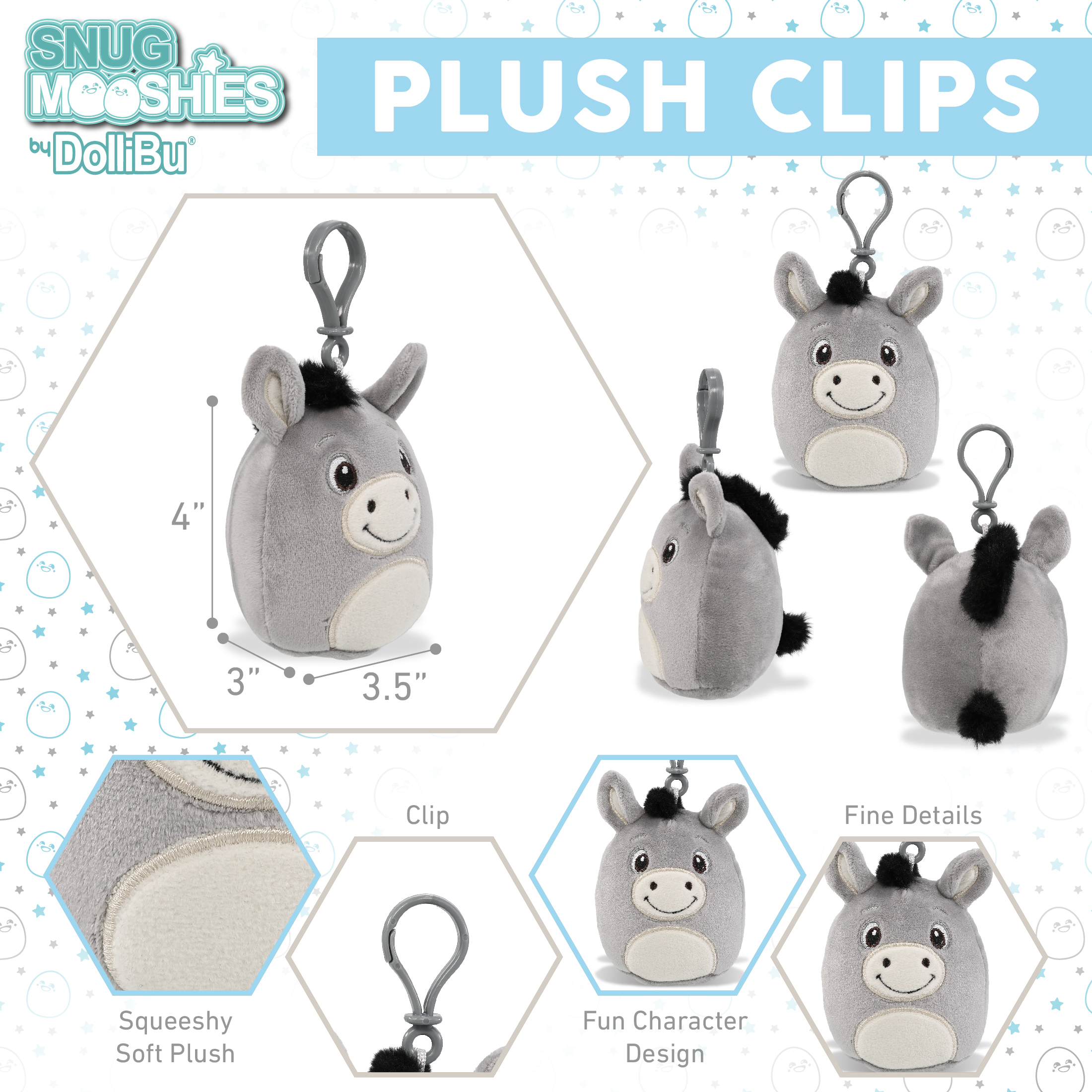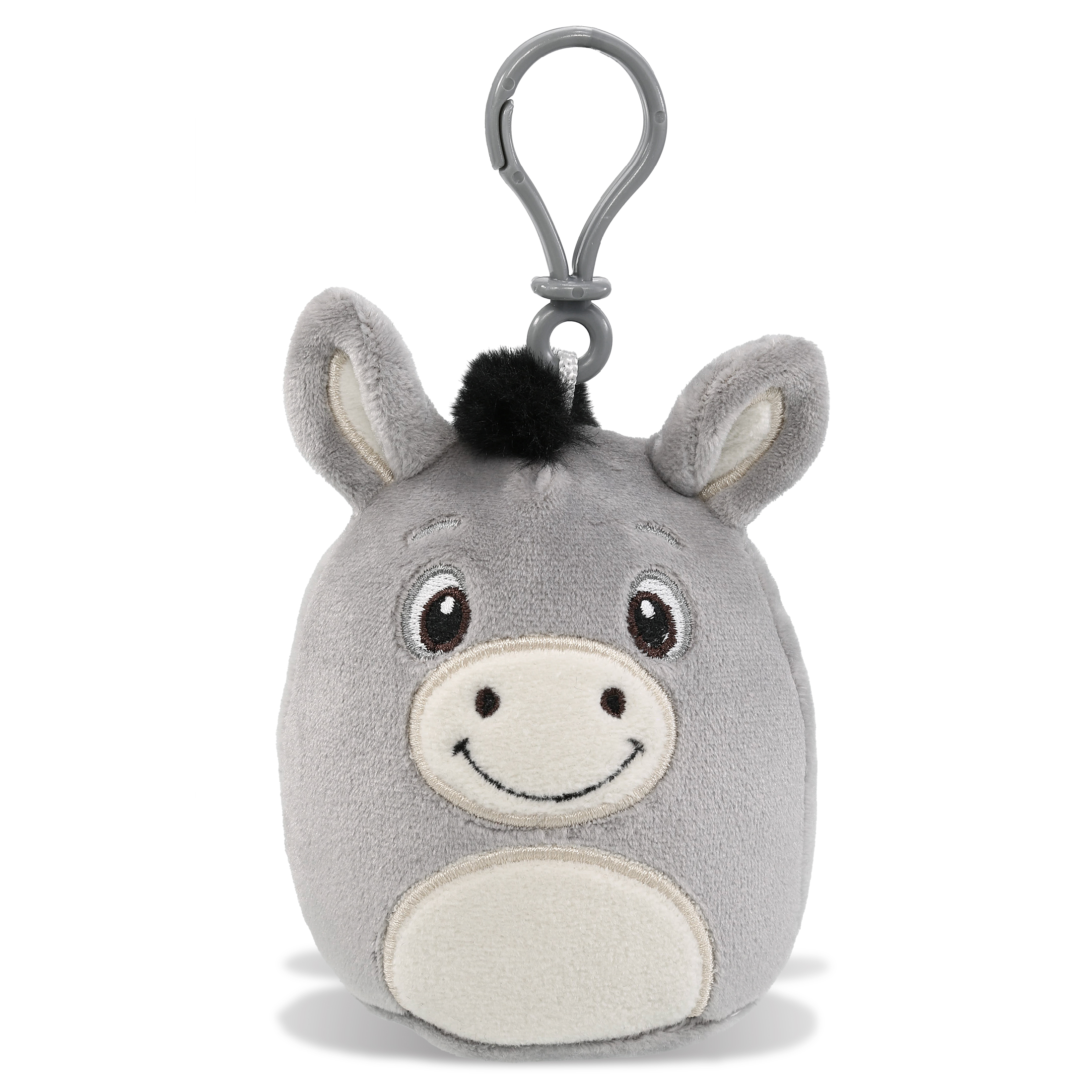 - Included with The Purchase of Snug-Mooshies Squishable Keychain – Includes 1 Snug-Mooshies Super Squishie Donkey Keychain Plush with a plastic lobster claw clasp clip for easy hanging. The donkey plush keychain features grey plush with cute grey embroidered details like a smiling face, round eyes, and realistic ears. The plush key chain is both squishie soft. The donkey plush stuffed animal backpack keychain measures 3.5Lx3Wx4H inches.