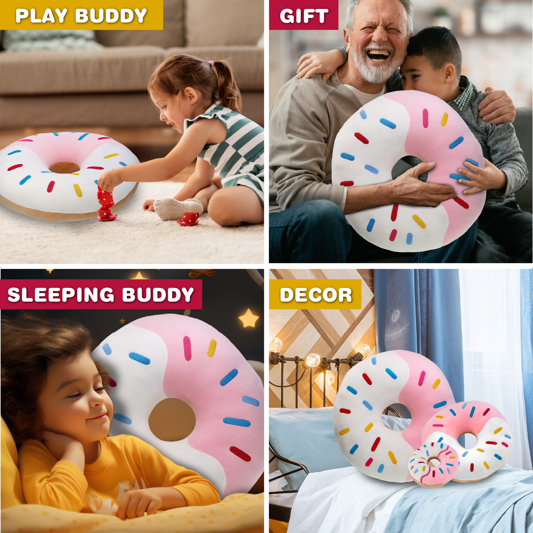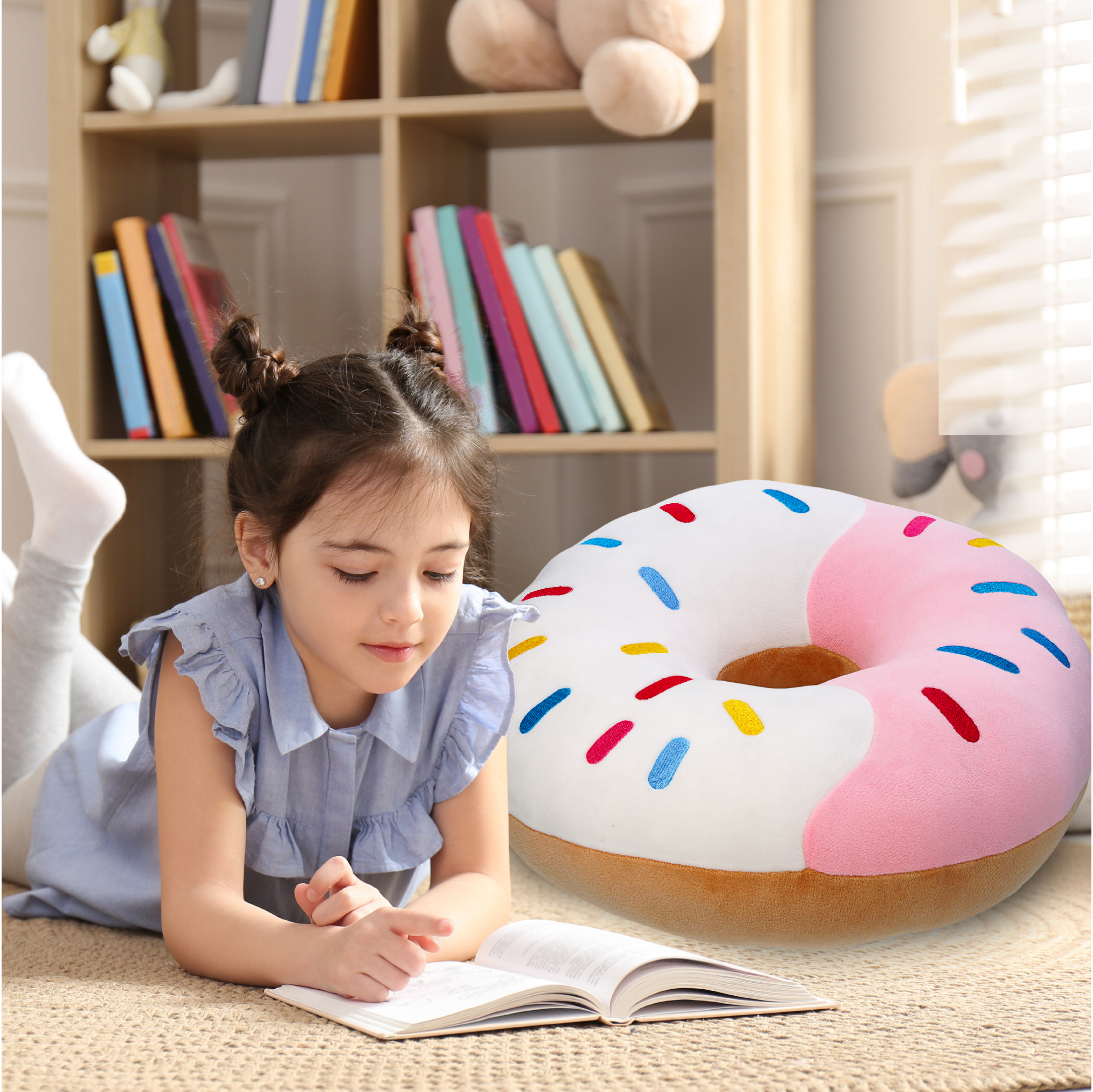 • Large Food-Themed Donut Plush Pillow for Resting, Lounging, and Display – This stuffed donut plush pillow is suitable for rest time, lounging, and decorative placement. The cushioned body works well on beds, couches, and playroom floors. Designed for bedrooms with food-theme design, reading corners alongside other plush toys, and cozy indoor spaces. Suitable for kids, teens, and adults.
