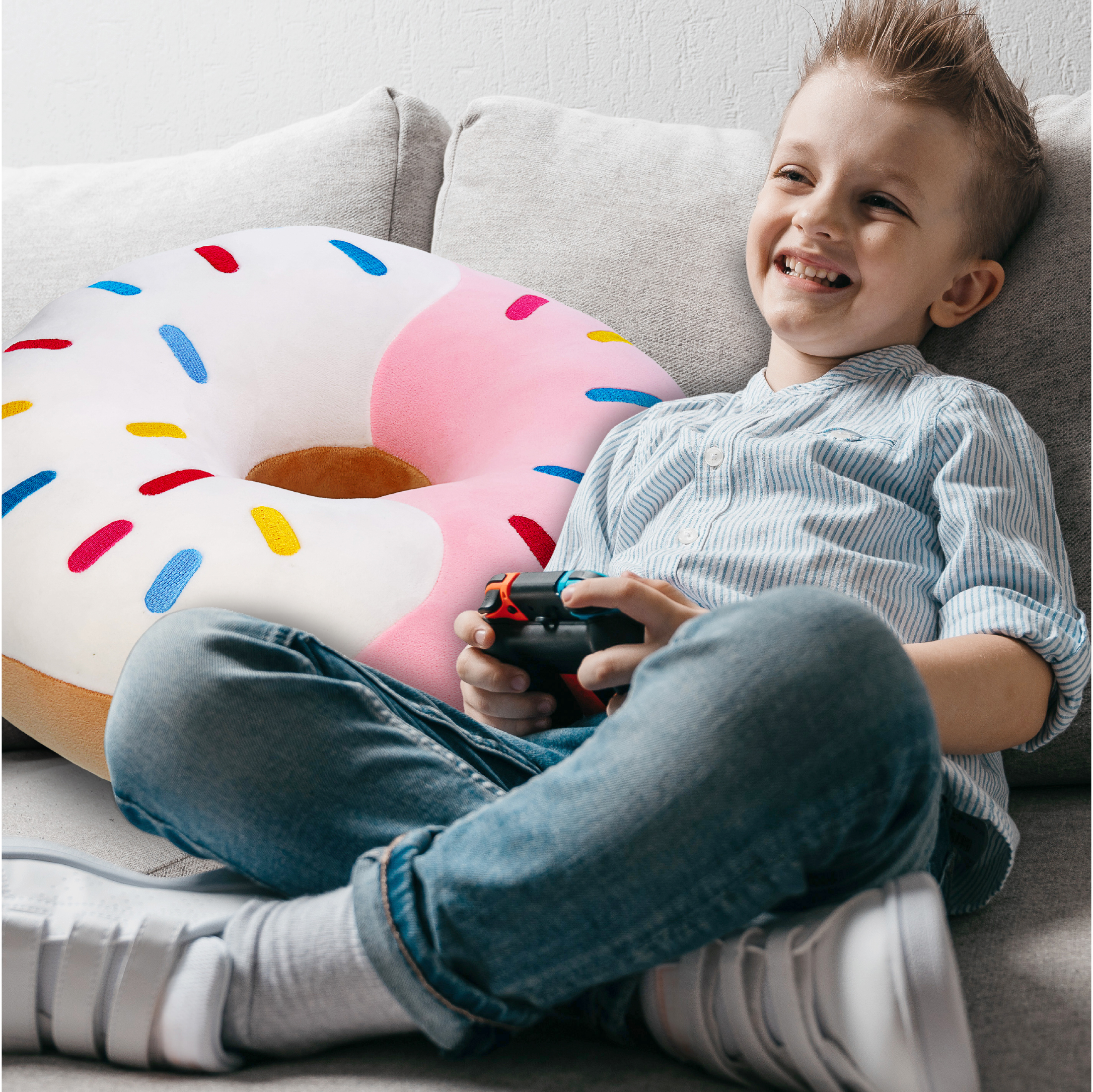 • This Snug-Mooshies Donut Plush Pillow Measures Approximately 18Lx17Wx5.5H Inches – This donut plush pillow is designed with a large, rounded pillow-style shape for resting and lounging. The oversized size makes it suitable for hugging, leaning against, or using as a soft cushion. Its wide surface provides comfortable support when placed on beds, sofas, or reading areas. Intended for indoor use in bedrooms, playrooms, or lounge spaces.