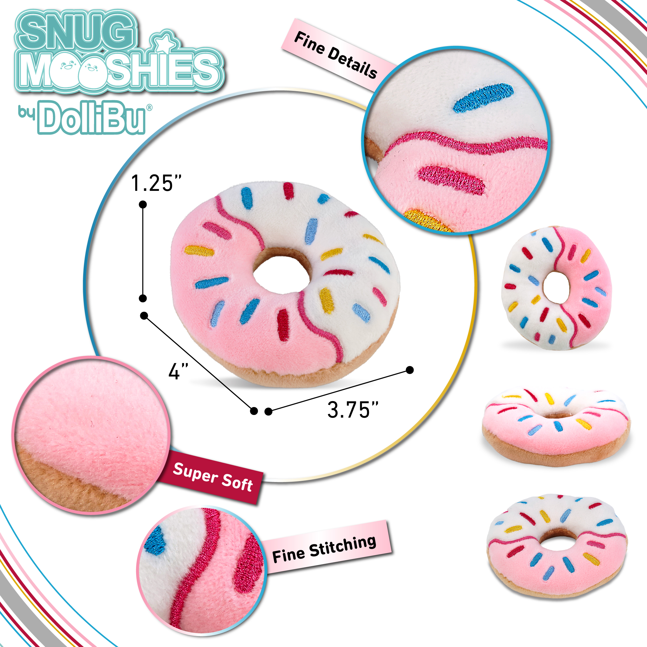 - This Snug-Mooshies Donut Plush Measures Approximately 4Lx3.75Wx1.25H Inches – This plush donut is designed in a small, compact size that is easy to hold, squeeze, and display. Its lightweight form fits comfortably in small hands and works well as a desk, shelf, or bedside accent. The rounded donut shape allows for easy handling during casual play or decoration. Intended for indoor use, collecting, or light everyday handling.