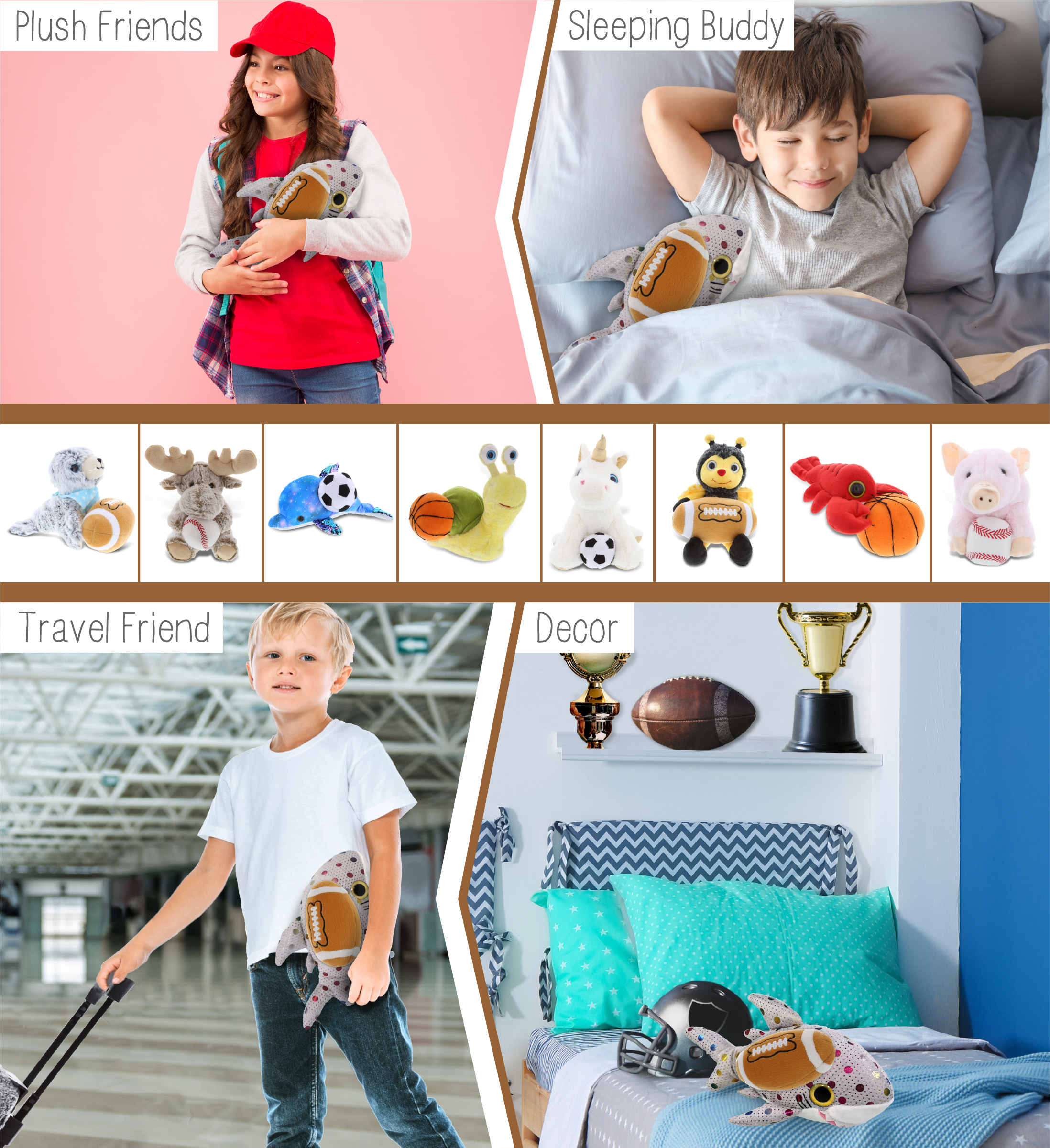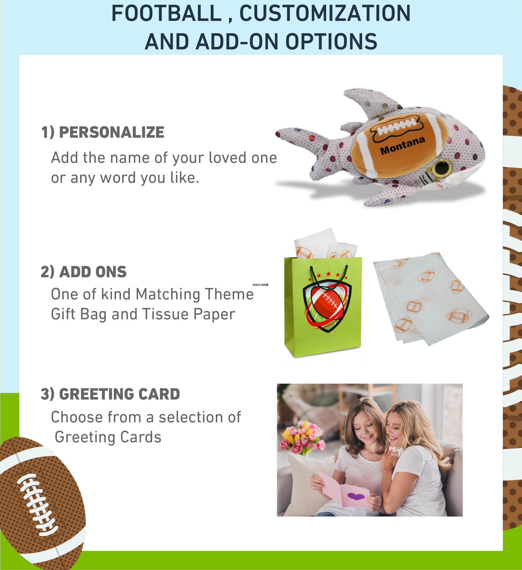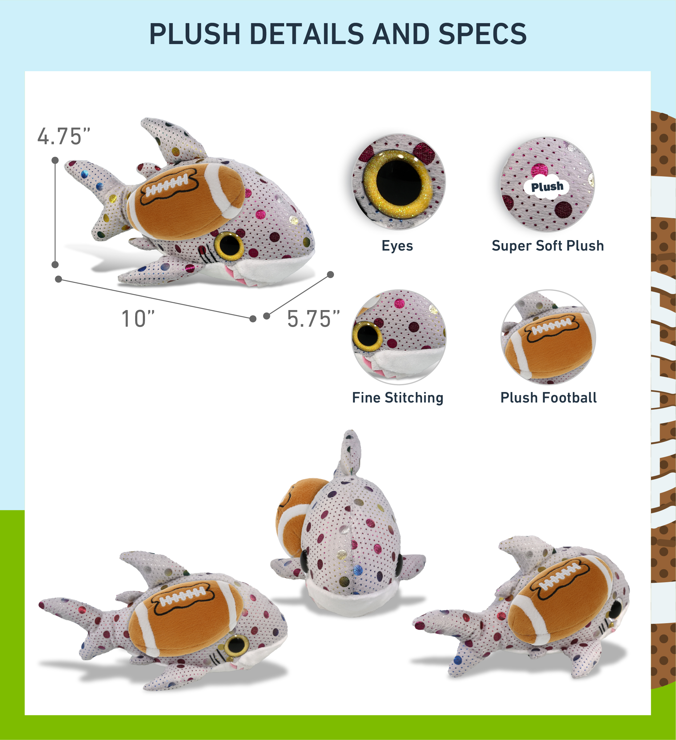 - Personalization, Customization, and Add-On Options – Super Soft Sports Stuffed Animal Big Eye Dotted Shark comes customized with a football plush. You can personalize it with the name of your loved one imprinted on the item. You also have the option to add some or all of the cool add-ons to make your gift extra special: 1) Gift Bag; 2) Tissue Paper; 3) Greeting Card.
