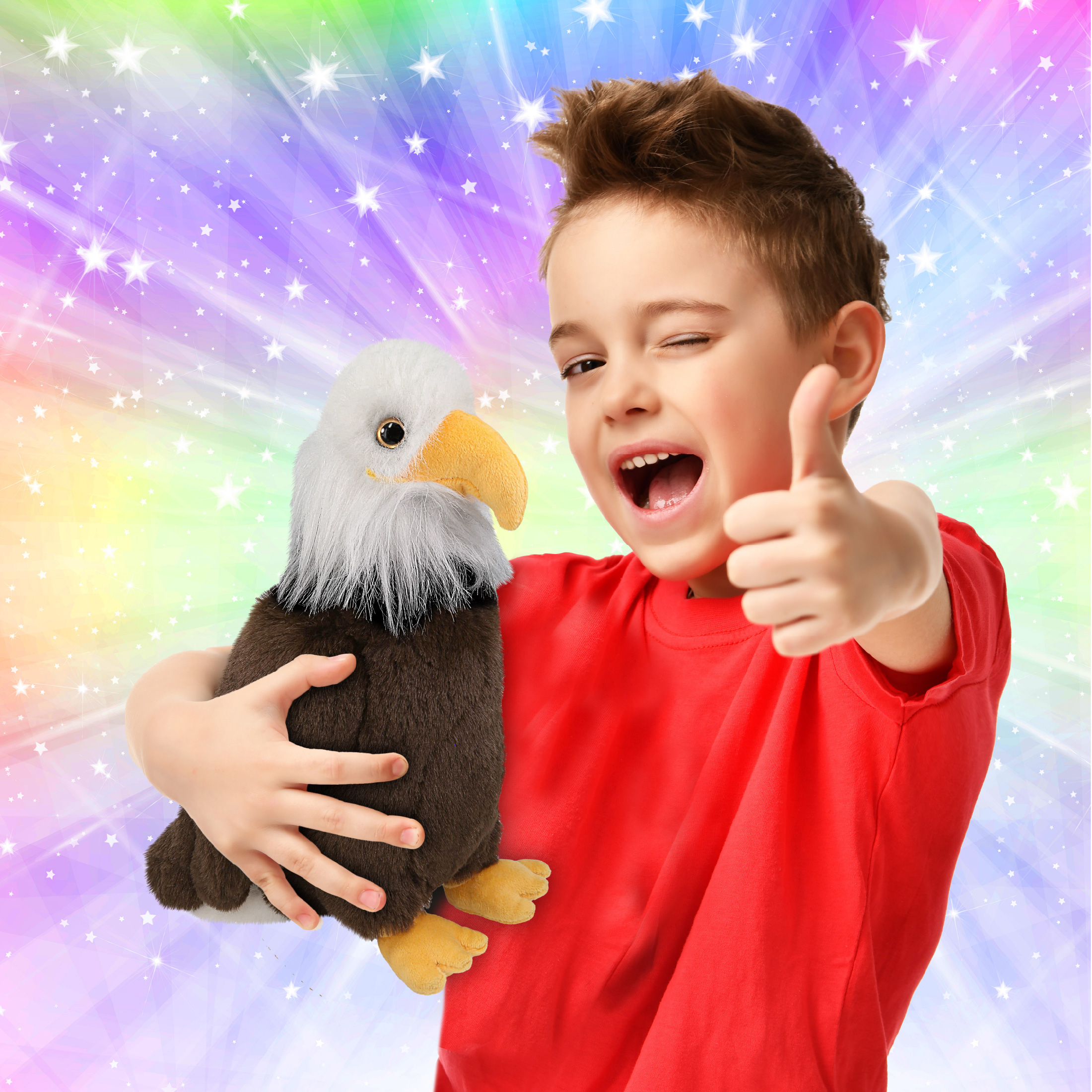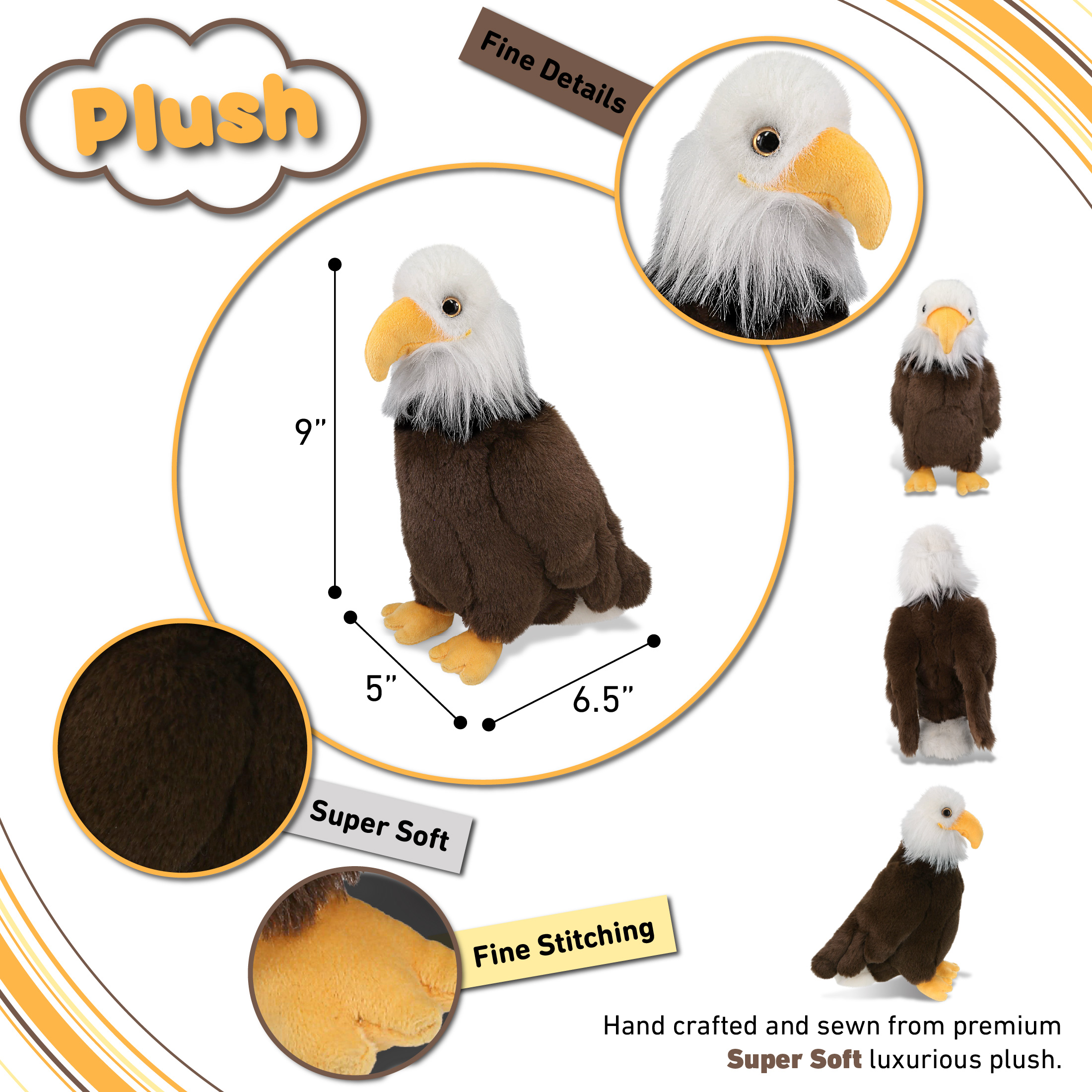 - Included with the Purchase of Plush Eagle Stuffed Animal – Includes 1 Eagle Stuffed Animal. Super soft stuffed animal eagle plush decorated with features its characteristic beak and wings. The eagle’s body is designed with fluffy and soft brown and white fabric, making it the perfect stuffed animals for cuddling. This realistic, cuddly eagle plush toy stuffed animals unique shape measures 6.5Lx5Wx9H inches.
