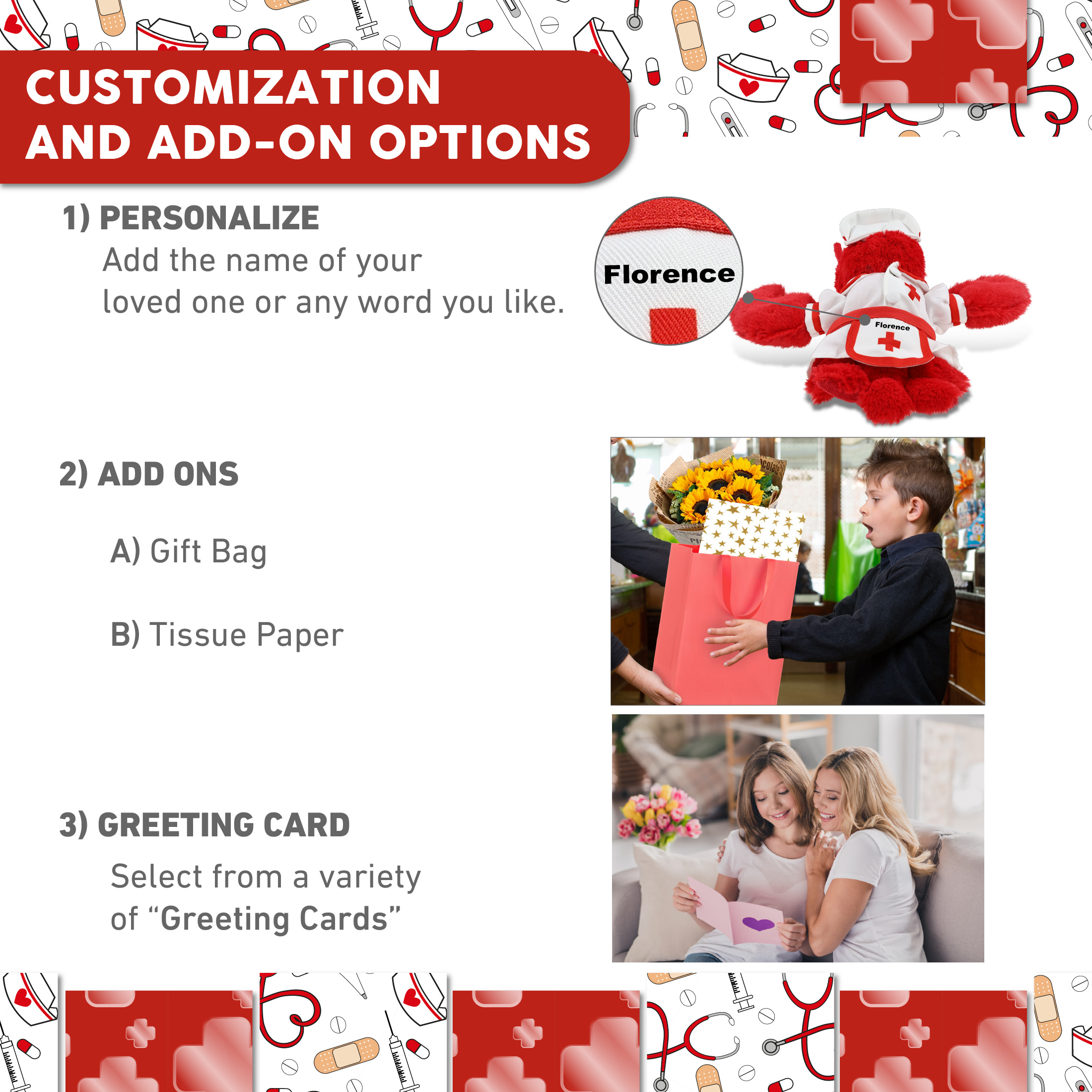 - Personalization, Customization, and Add-On Options – The stuffed Lobster comes dressed in a cute nurse costume, complete with nurse cap, nurse dress and apron. Make your nurse teddy bear stuffed animal plush special by adding a personalized name, which we’ll imprint onto the plush. You can also customize your nurse lobster plush by adding any of our add-ons to create the perfect gift: 1) Gift Bag 2) Tissue Paper 3) Greeting Card.